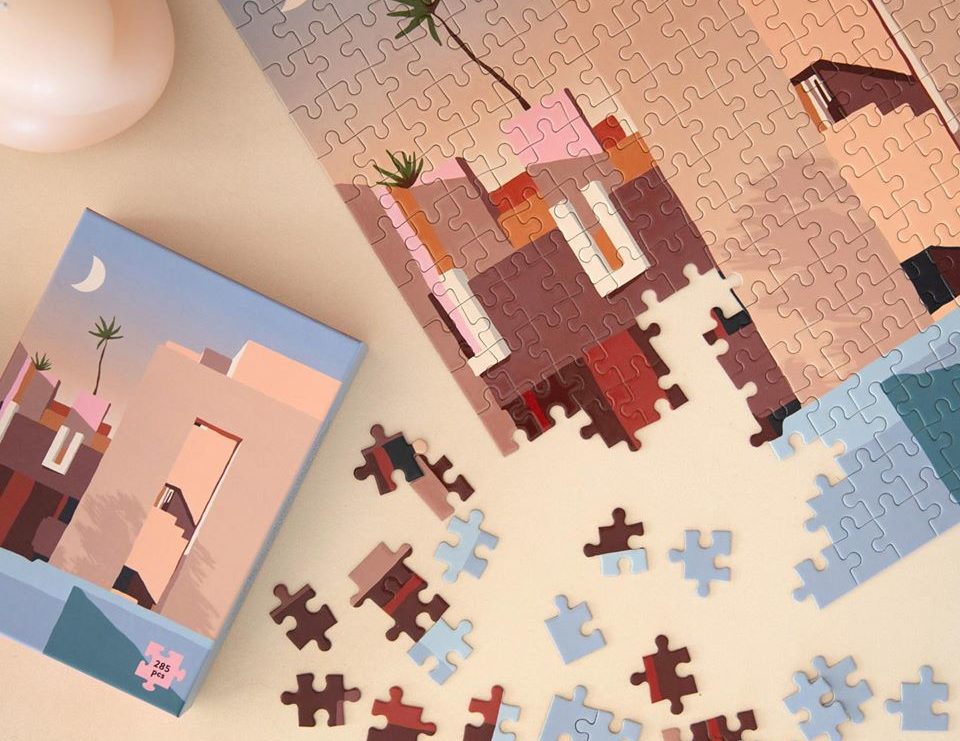 Basé sous le soleil de Los Angeles, le studio Slowdown édite des tapis et du linge de maison aux imprimés graphiques et aux motifs ludiques. On retrouve les couleurs pastel fétiches du studio sur un ensemble de trois puzzles. Ces trois puzzles sont dédiés à des bâtiments célèbres de l’architecture contemporaine: le complexe d’appartements La Muralla Roja (1968, Calpe), le Palais Bulles (1984, Canne) et le pavillon Site of Reversible Destiny (1995, Yoro park de Gifu). Puzzles d’env 300 pièces chacun.