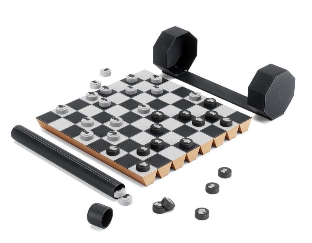 Le jeu d’échec et de dames mobiles Rolz (Umbra) peut être enroulé et rangé dans la boîte compacte.