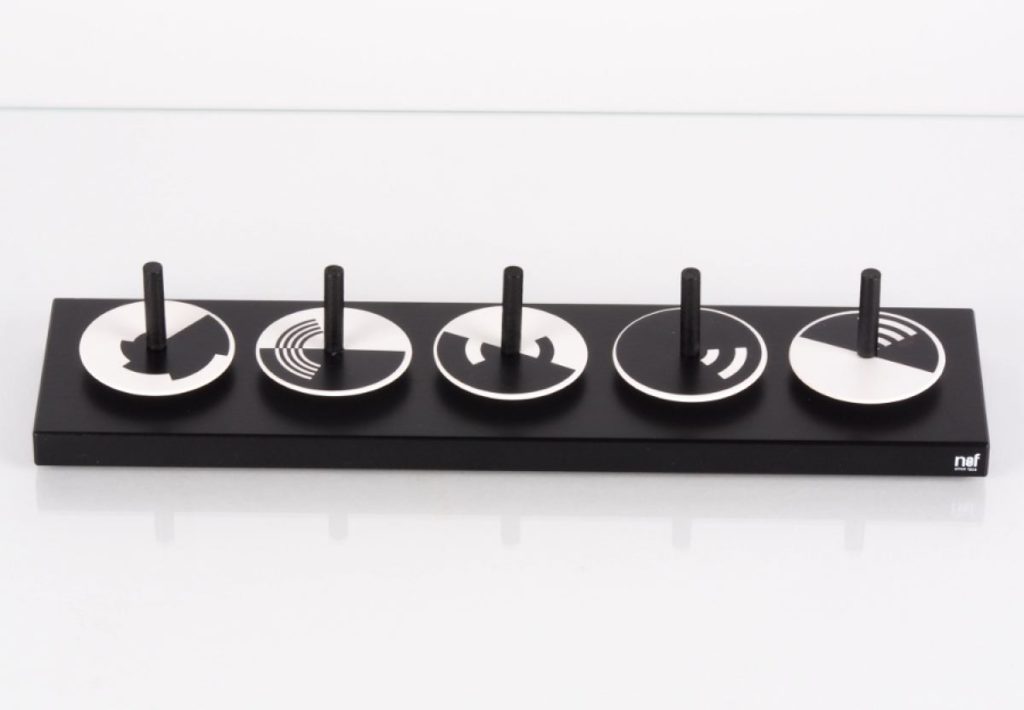 L’oeil voit, l’esprit pense… Le noir et le blanc ne sont pas toujours « noir et blanc » comme le prouvent les circonvolutions des toupies Op Tric. Dessinées par Heiko Hilig, elles sont produites en Suisse par le fabricant Naef Spiele.