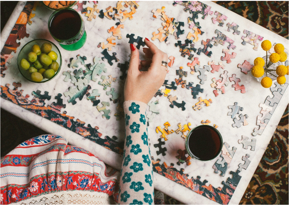 Piecework est une très belle marque de puzzles qui porte une grande attention au design de ses produits et à leur packaging. On y trouve beaucoup de natures mortes contemporaines et des images entre monde réel et imaginaire. A l’instar du puzzle Meta qui donne l’illusion qu’une femme est en train de terminer son puzzle.