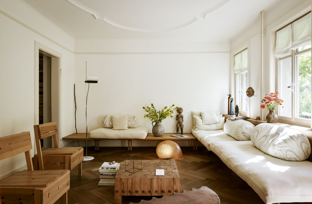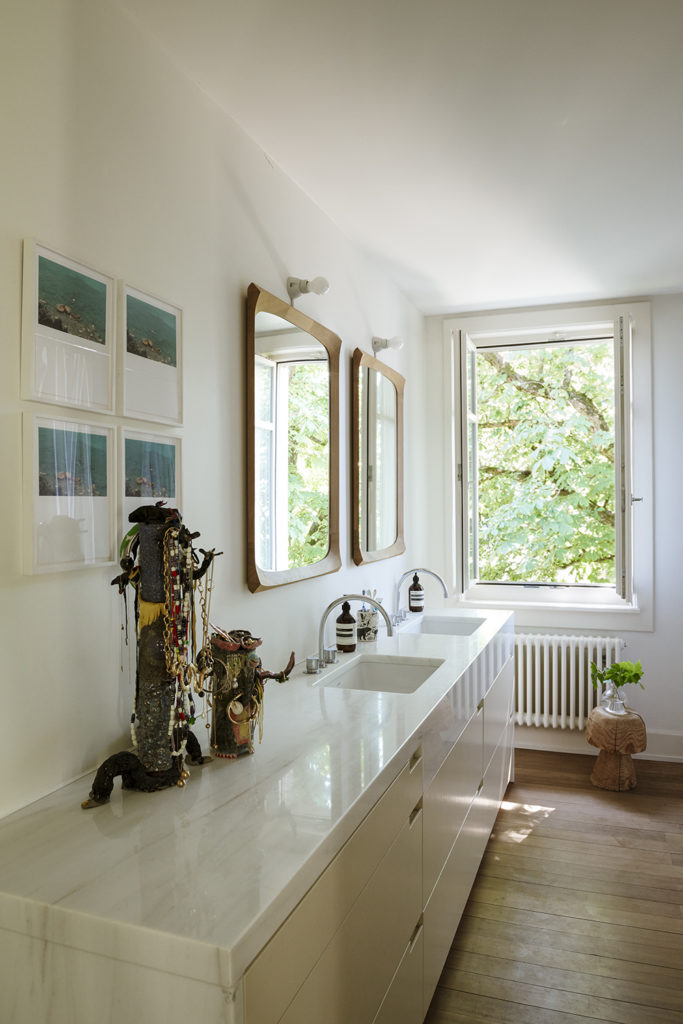 – Je me laisse guider par les lieux. Ici, il s’agit d’une maison de ville zurichoise du début du 20e siècle. Quand c’est possible, j’intègre du mobilier dans l’espace, comme la banquette conçue sur mesure installée dans le salon. Concernant les objets, j’aime créer des associations, par exemple je n’ai que des lampes italiennes. J’apprécie les artistes et les designers qui produisent des œuvres simples mais dont la réalisation ou le concept sont de grande qualité. J’ai un penchant pour tout ce qui est organique, les matériaux authentiques comme la terre, avec une prédilection pour les formes rondes! Ma maison est remplie d’objets qui nous inspirent, ma famille et moi. Nous avons une vie très citadine, tout en vivant simplement, dans un rapport fonctionnel à l’essentiel. C’est une démarche vivante et en mouvement, avec cette envie de ne jamais avoir fini de meubler et décorer !