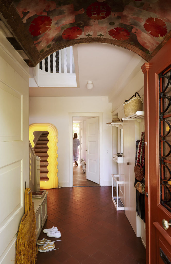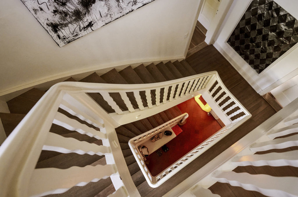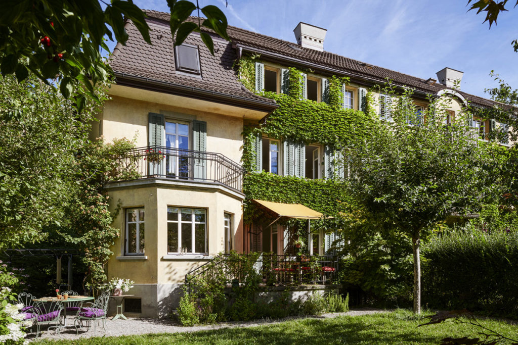 -Occupée par une même famille durant près d’un siècle, la maison témoigne de l’histoire du patrimoine zurichois. Il a donc été essentiel pour nous de préserver au maximum son intégrité. Néanmoins les toits, le chauffage, les sanitaires en piteux état ont nécessité de gros travaux de rénovation. Nous avons travaillé avec un architecte de l’Atelier Semadeni Hotz, spécialisé dans les bâtiments anciens et la conservation du patrimoine. Classée, la structure du bâtiment et tout ce qui était d’origine, beau et de qualité ont naturellement été conservés. Ainsi, dans l’entrée, le plafond recèle un trésor fantastique: une peinture réalisée par l’assistant d’Augusto Giacometti (parent lointain d’Alberto) lorsque l’artiste avait été mandaté pour peindre le hall richement décoré du célèbre poste de police «Blüemlihall». Si nous n’avons guère d’informations sur les circonstances de cette réalisation, elle reste une copie quasi conforme des œuvres de son maître.