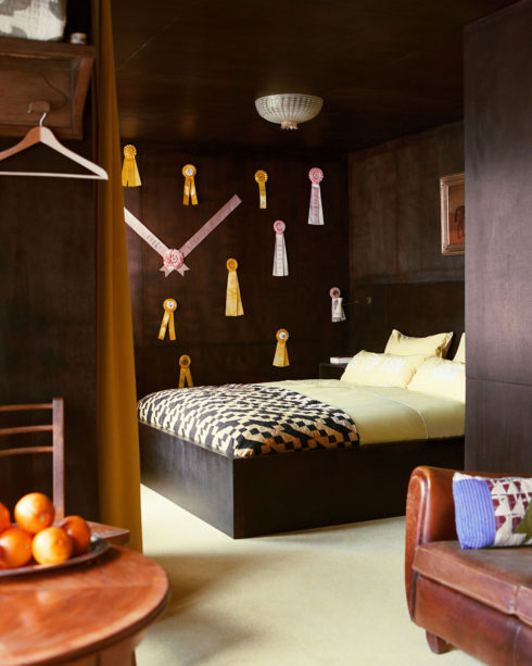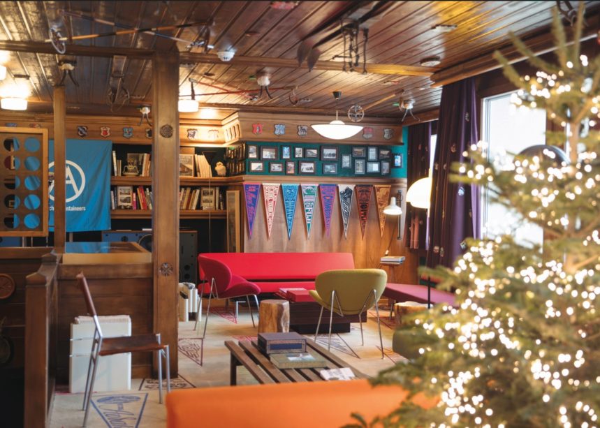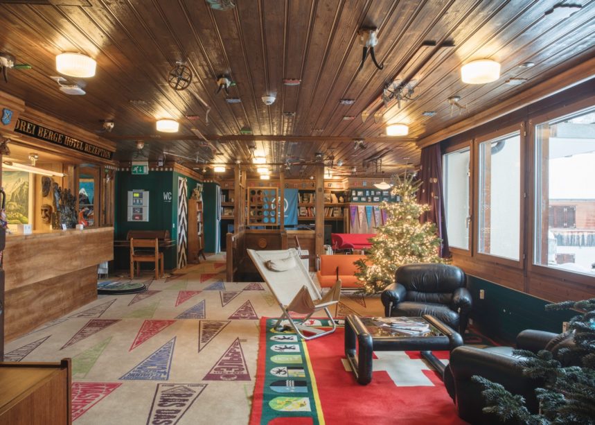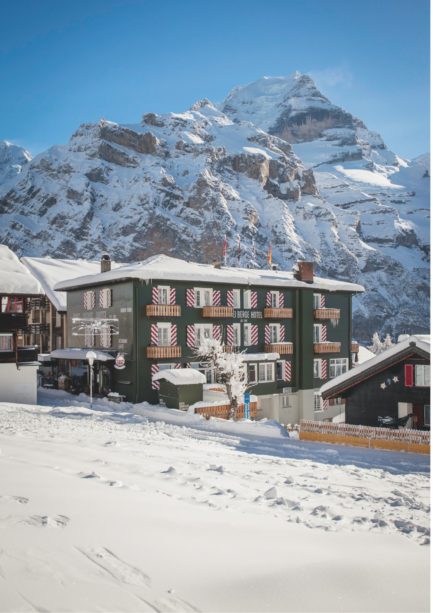 Façade vert sapin et volets à chevrons rouges et blancs, l’hôtel de 20 chambres porte la signature de Ramdane Touhami: un mélange impertinent de styles, de culture pop et de vintage; un éclectisme qui mélange des éléments Belle Époque aux murs de couleurs vives et tableaux illustrant la splendeur d’antan. En fait, l’entrepreneur a conçu la déco comme un hommage à la région et a fait broder des armoiries suisses sur les rideaux, dessiné des moquettes avec des ours ou des fanions aux noms de sommets et a repris les panneaux jaunes des chemins de randonnée pour la signalétique. Une revisite désinvolte des codes du pittoresque helvétique qui va jusqu’à la cuisine proposé par le chef.