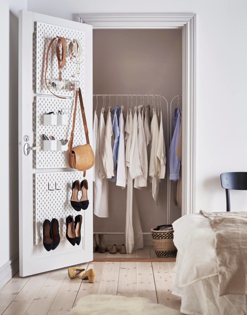 Pegboard Skadis, Ikea. Le système de rangement est ici utilisé sur une porte.
