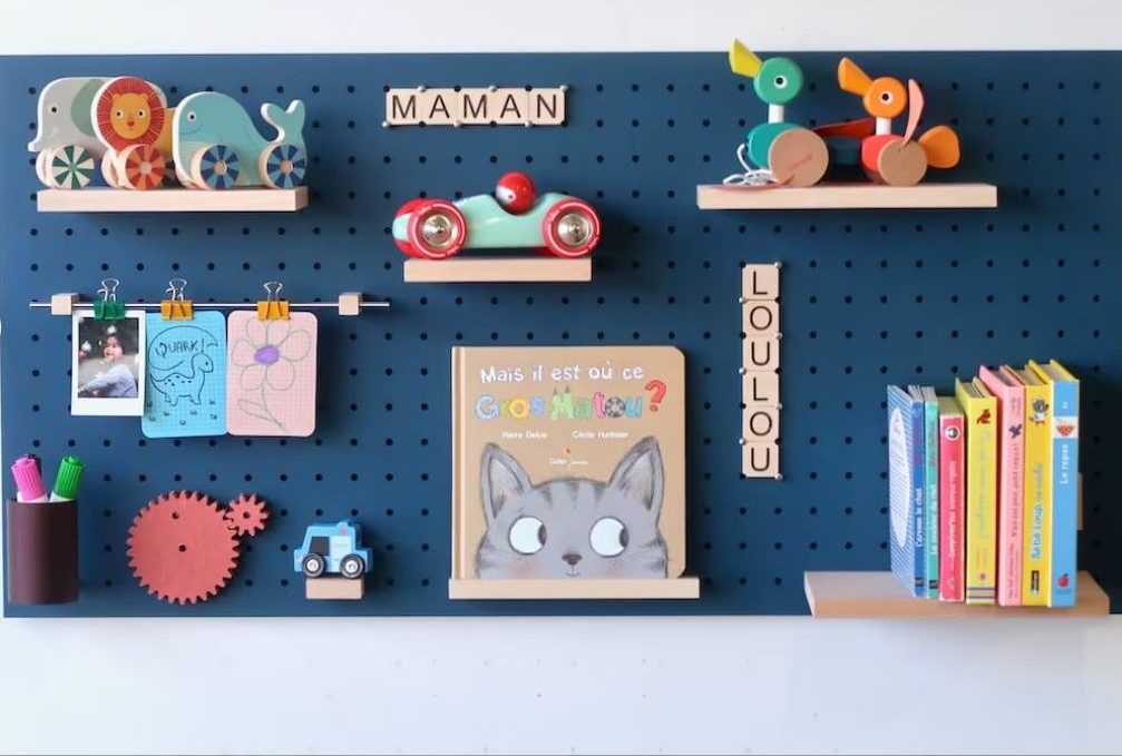 Pegboard Quark. Le système de rangement est ici utilisé dans une chambre d’enfant.