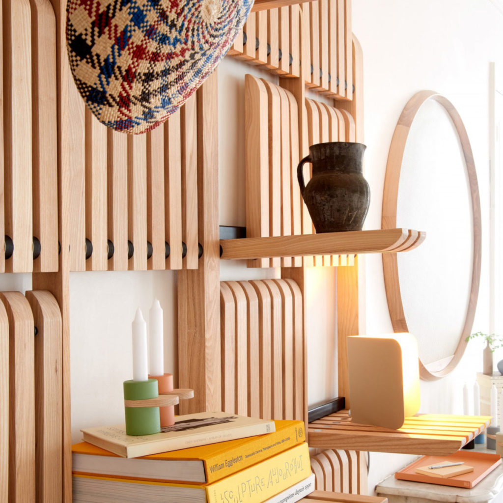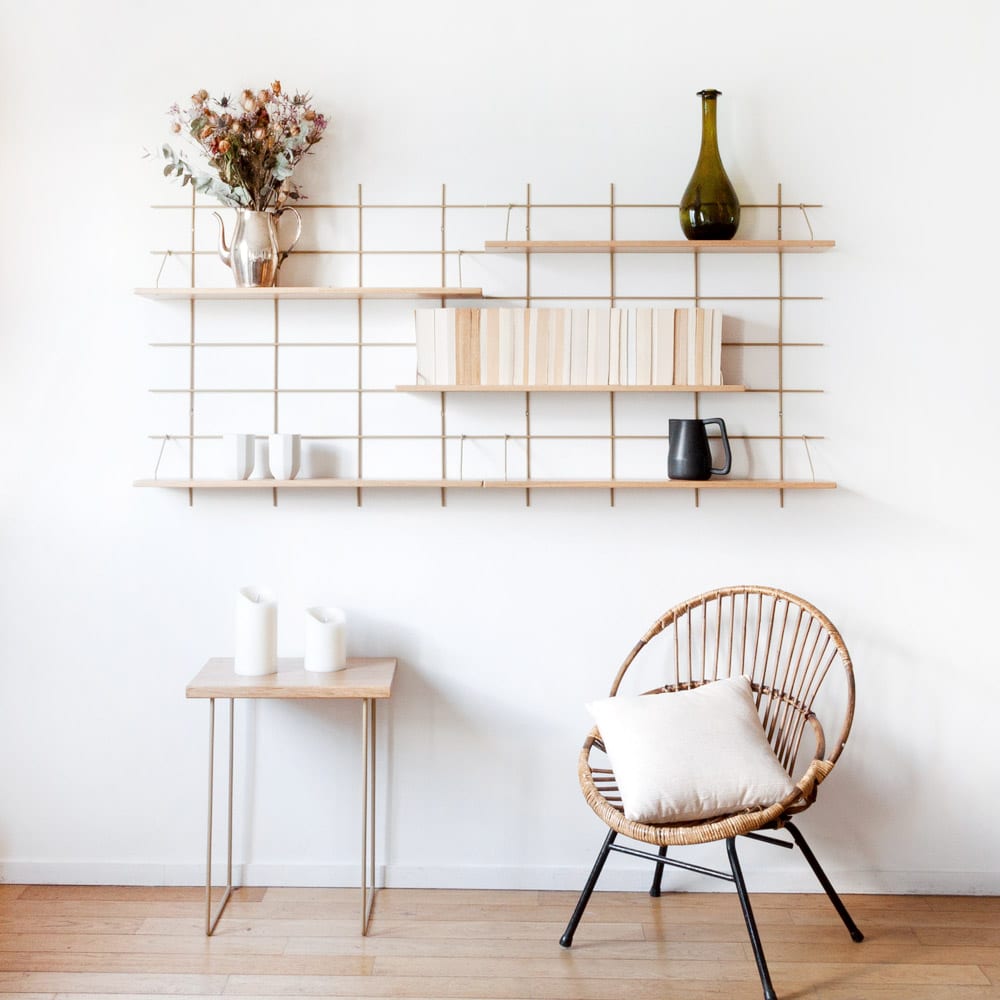 La marque Gassien Paris propose des étagères murales à composer soi-même grâce à un configurateur. On accroche ce que l’on veut sur une base murale en forme de grille.