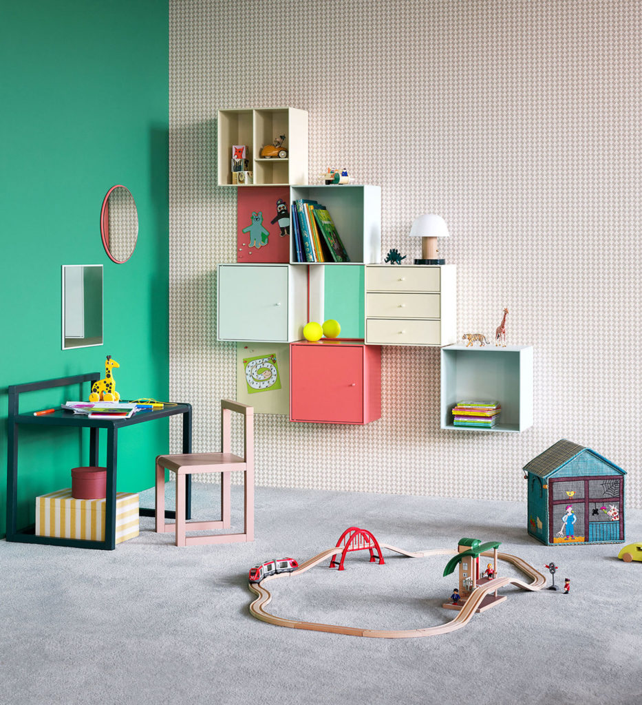 S’apparentant à des boîtes, les modules d’étagères suspendues Montana Furniture sont ici utilisés dans une chambre d’enfant.