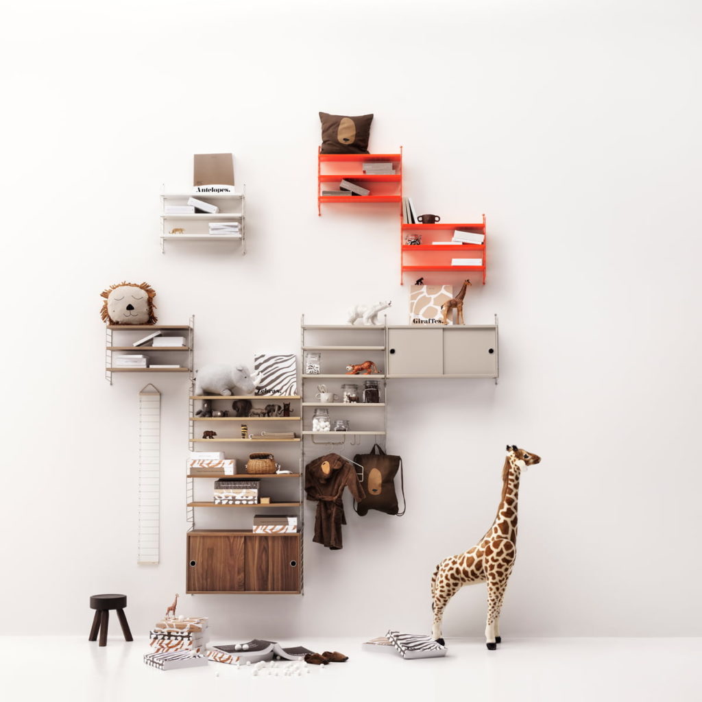 String System dans une chambre d’enfants. Les étagères ouvertes comprennent des modules fermés. Elles sont organisées de manière à créer des compositions décalées et asymétriques sur le mur.