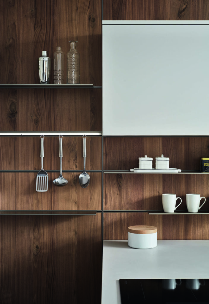 Modèle Groove, Veneta Cucine. Des anneaux muraux pour supporter les étagères sont utilisés dans la cuisine.