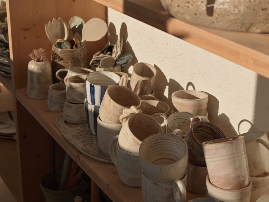 Cette proximité de l’atelier avec son domicile permet aussi à Jil de partager son goût du travail artisanal avec ses trois enfants, qui suivent avec elle une scolarité à la maison. En effet, son projet de vie autour la céramique est teinté d’une dimension familiale. Et l’on découvre dans son atelier un rayon d’étagères qui est dédié à ses enfants, avec des mini théières, des robots et des bougeoirs réalisés avec très peu « d’aide de maman ».
