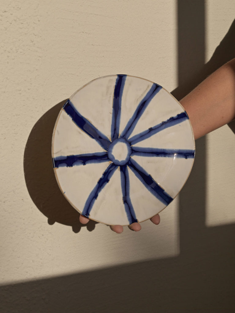 Ce qu’elle apprécie souvent le plus est de réaliser des pichets. De différentes hauteurs, avec ou sans hanse. Parfois légèrement pigmentés, avec des dégradés de couleurs neutres qui traverseront le temps ou bien des motifs lignés. Le ligné blanc et bleu est d’ailleurs l’un de ses graphismes préférés.