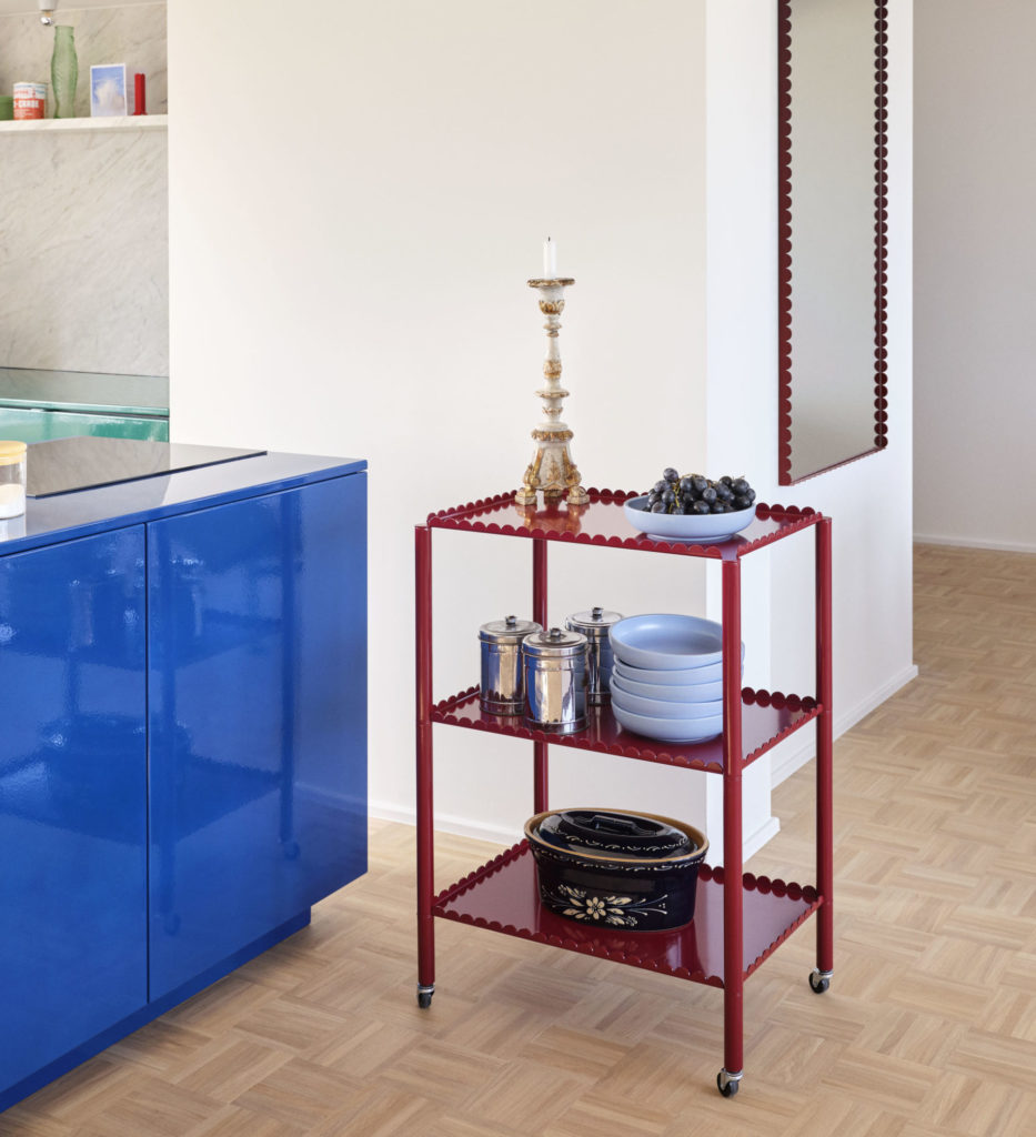 Dessinée par le duo d’artistes Muller Van Severen, la table sur roulettes Arcs présente un profil festonné caractéristique. Plusieurs couleurs disponibles.