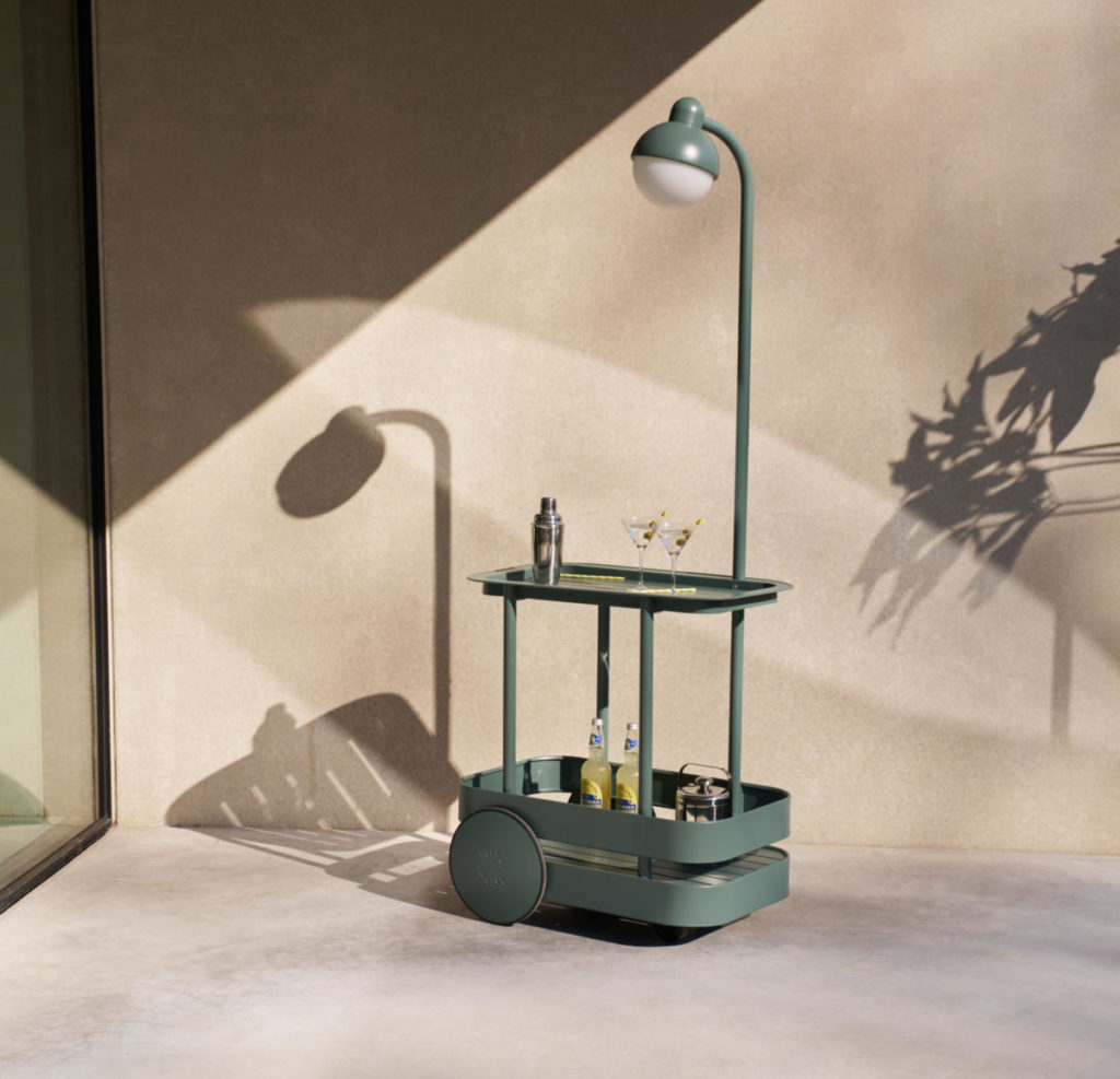 Chariot Ninfea dont le plateau se transforme en petite table d’appoint. Peut être laissé à l’extérieur.
