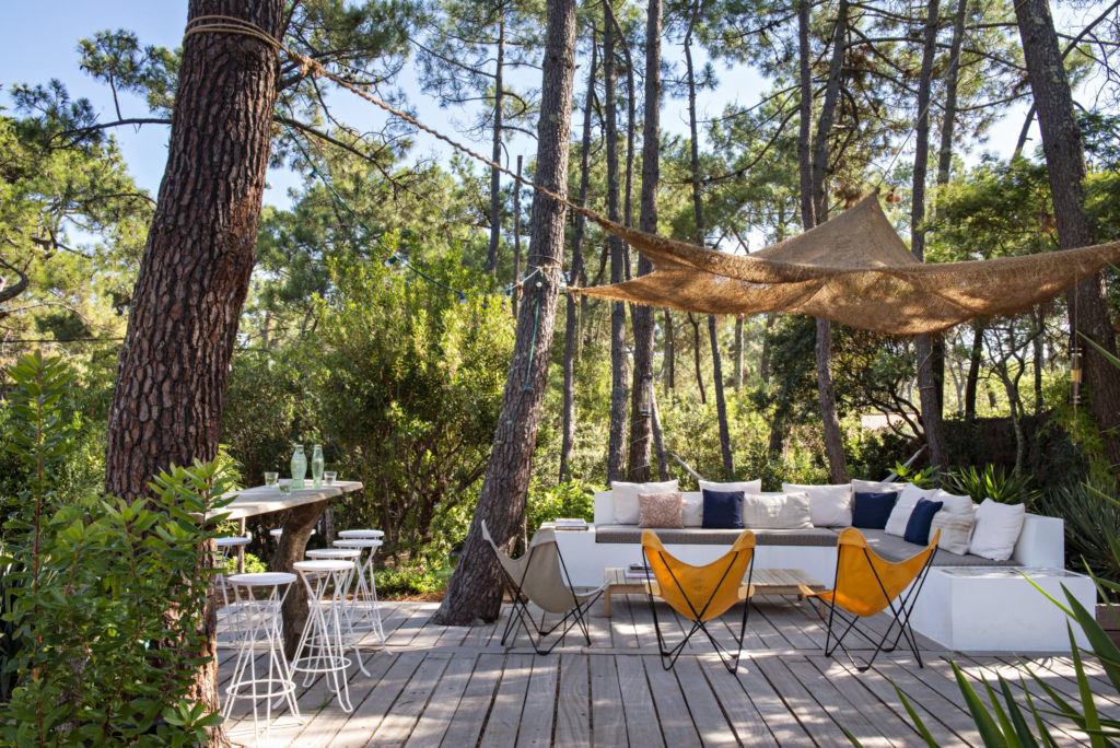 La maison principale présentée ici comprend 4 chambres, 3 salles de bain et une grande pièce de vie baignée de lumière regroupant le salon, la salle à manger et la cuisine. Elle s’étale sur une superficie de 170m2 de plain-pied. Dans le jardin, deux cabanes bardées de pin teinté en noir abritent chacune une chambre ornée d’une fresque ainsi qu’une salle de bain. De quoi offrir aux invités un confortable espace d’intimité à l’atmosphère de robinsonnade.
