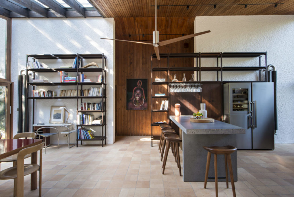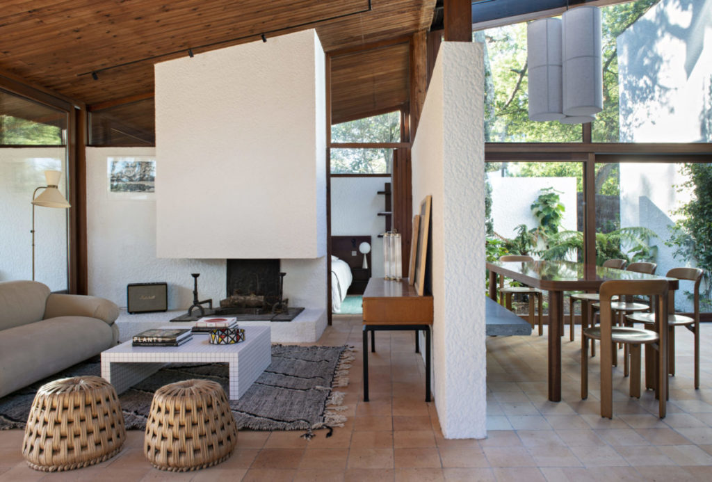 Les menuiseries en bois qui au fil du temps avaient été remplacées par des cadres en alu ont été renouvelées pour s’uniformiser avec le lambris des plafonds. Chaque pièce est décorée de nombreux meubles et objets vintage dans une harmonie de tons chauds, de matériaux naturels et bruts comme le bois et le béton, associés à des tissus texturés et à des motifs évoquant les années Peace and Love.