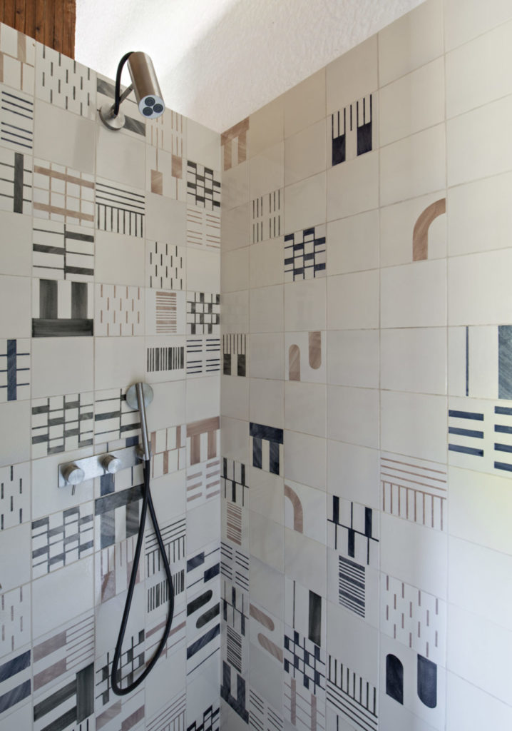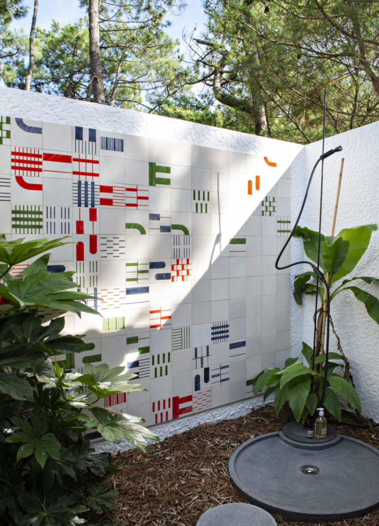 Pour la restauration des salles de bain, l’architecte d’intérieur a opté pour le béton brut assorti à des carreaux peints à la main provenant de Sicile. Ces derniers reprennent un motif des années 70 décliné dans différentes couleurs. Ils ornent également les cloisons de la douche à ciel ouvert et les banquettes maçonnées du jardin.