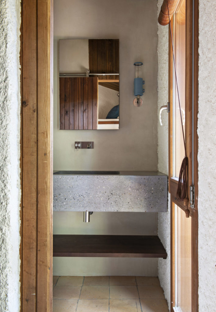 Tout a été dessiné dans le respect de l’esprit d’origine de la maison. Les matériaux simples et peu nombreux déjà présents ont été rénovés avec soin. Les carreaux de sol en terre cuite ont été poncés pour obtenir une nuance plus claire et prolongés sur les terrasses.