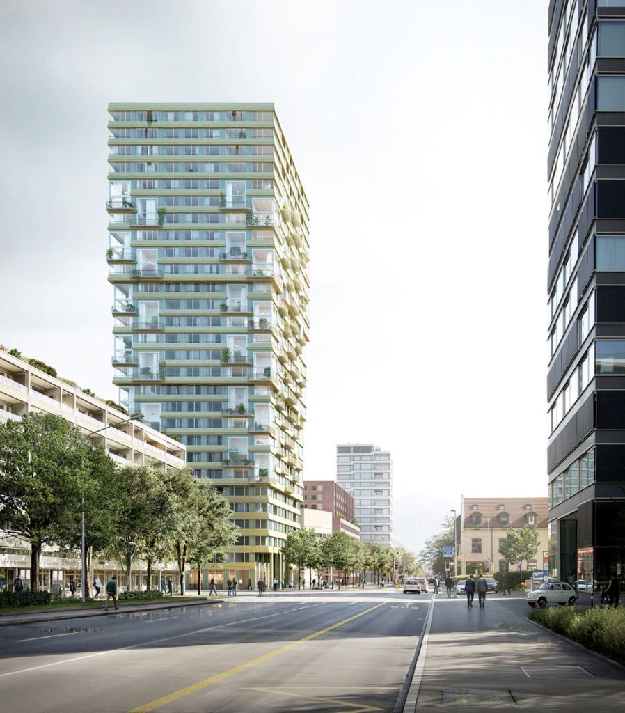 Un autre projet de tour en bois d’envergure est celui de la tour Pi, à Zoug, dessinée par Duplex Architectes. Si le projet est actuellement en pause, son ambition est de s’élever à 80 mètres de hauteur.