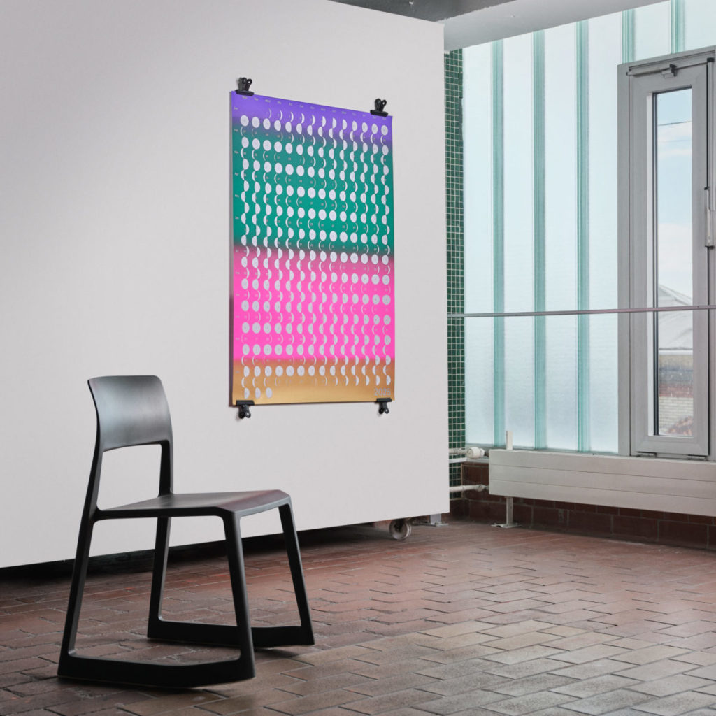 L’agence de design graphique située à La Chaux-de-Fonds SUPERO se lance chaque année dans la création d’un nouveau calendrier lunaire baptisé «SUPERMOON». Ici toute l’année s’y déploie en une seule affiche à l’esthétique minimaliste. Cette affiche est imprimée en sérigraphie en Suisse (Sérigraphie Madame, Genève). Il s’agit d’un objet de design à part entière. Les différentes phases de la lune émergent dans l’obscurité grâce à une encre phosphorescente. Format: 841 × 1189 mm. supero.ch/shop
