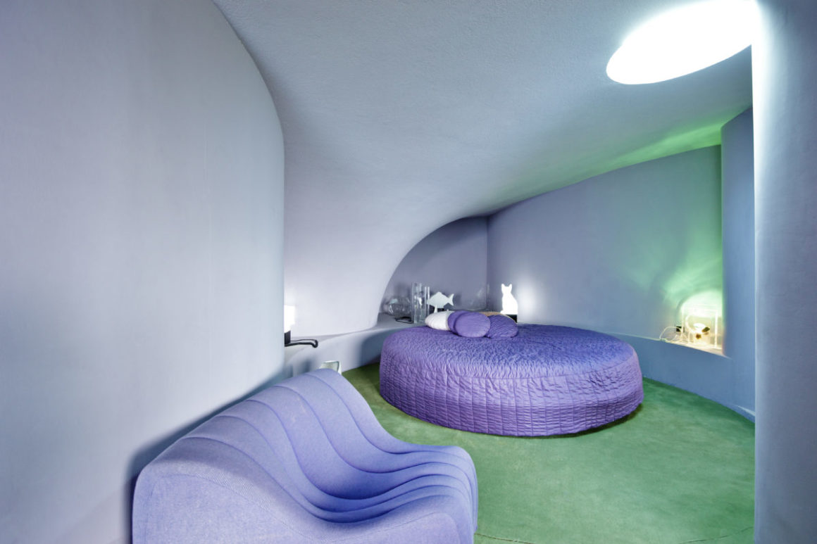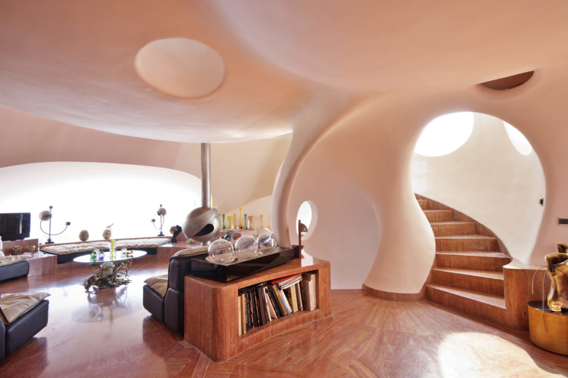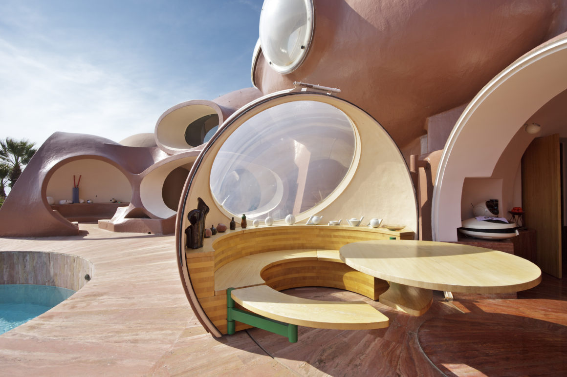 «L’architecture ne m’intéresse pas, déclarait Antti Lovag, qui ne se disait pas architecte, mais «habitologue». (…) Je travaille comme un tailleur, je fais des enveloppes sur mesure.» L’habitologue concevait les espaces depuis l’intérieur, par simulation: aux proportions en deux dimensions du canon humain debout, il ajoutait celles d’une troisième dimension, la gestualité, puis d’une quatrième , le déplacement. Le client se trouvait dès lors confronté dès le début à l’élaboration de sa propre maison. Il en résulte une infinie variété d’agencements possibles à partir de cylindres ou de sphères constituées par un réseau métallique ôtant toute distinction entre le sol, les murs et la toiture.