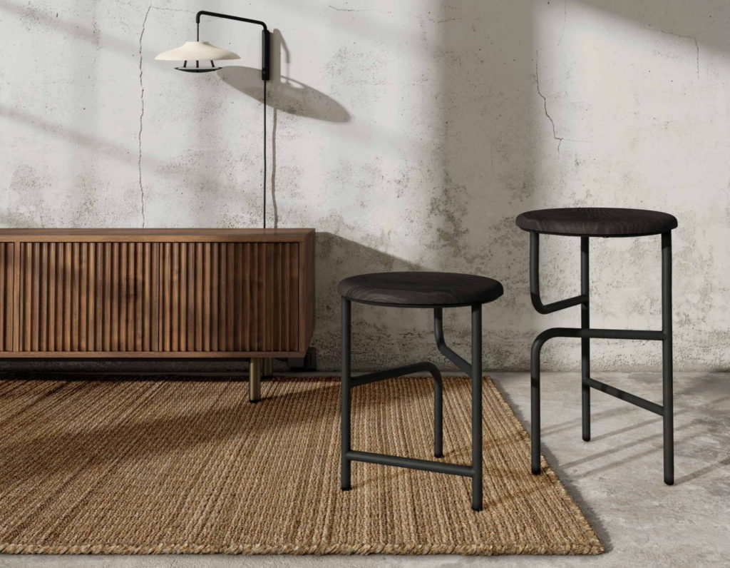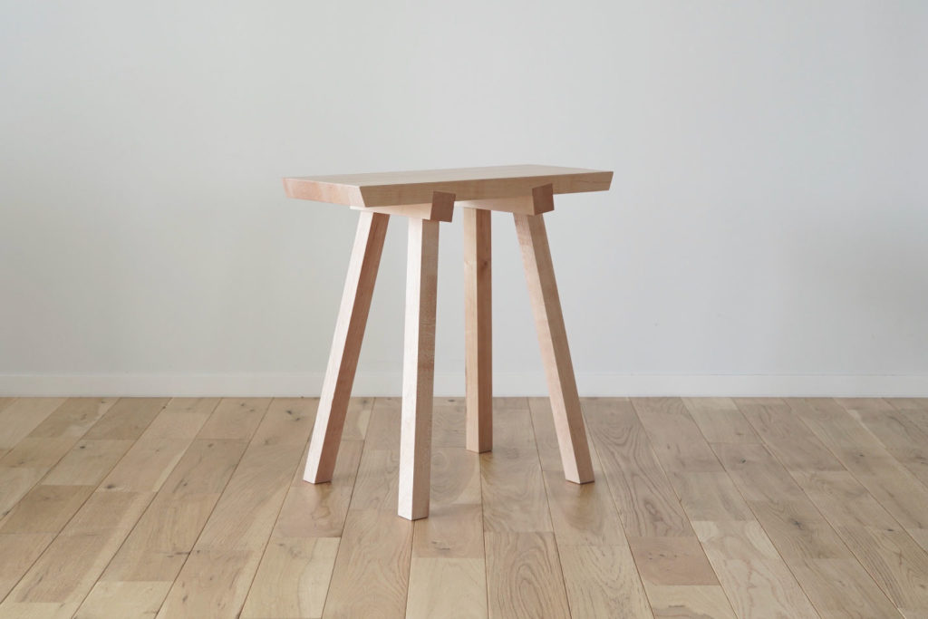 La marque japonaise Karimoku New Standard (KNS) a été fondée en 2009. Ici un tabouret dessiné par des designers internes à l’entreprise. Basé sur l’image d’un torii, ou porte de sanctuaire shinto, ce tabouret présente des pieds qui pénètrent dans le siège pour créer une forte impression. L’articulation entre les pieds et l’assise est réalisée avec une précision élaborée, inspirée de la méthode de menuiserie japonaise shikuchi.
