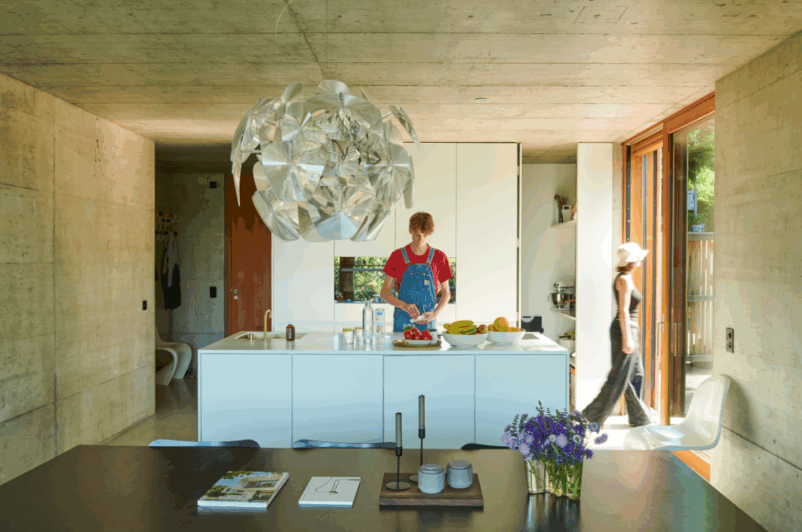 En intérieur prend aussi place une géométrie simple et fonctionnelle: l’intention des architectes était de créer des espaces généreux dans ce volume restreint (59 m2 par étage). Les architectes ont ainsi travaillé sur la perception de l’espace, les perspectives et les axes de vue, imaginé un espace de vie, avec une cuisine ouverte sur le salon et, latéralement, sur le jardin et sa terrasse.