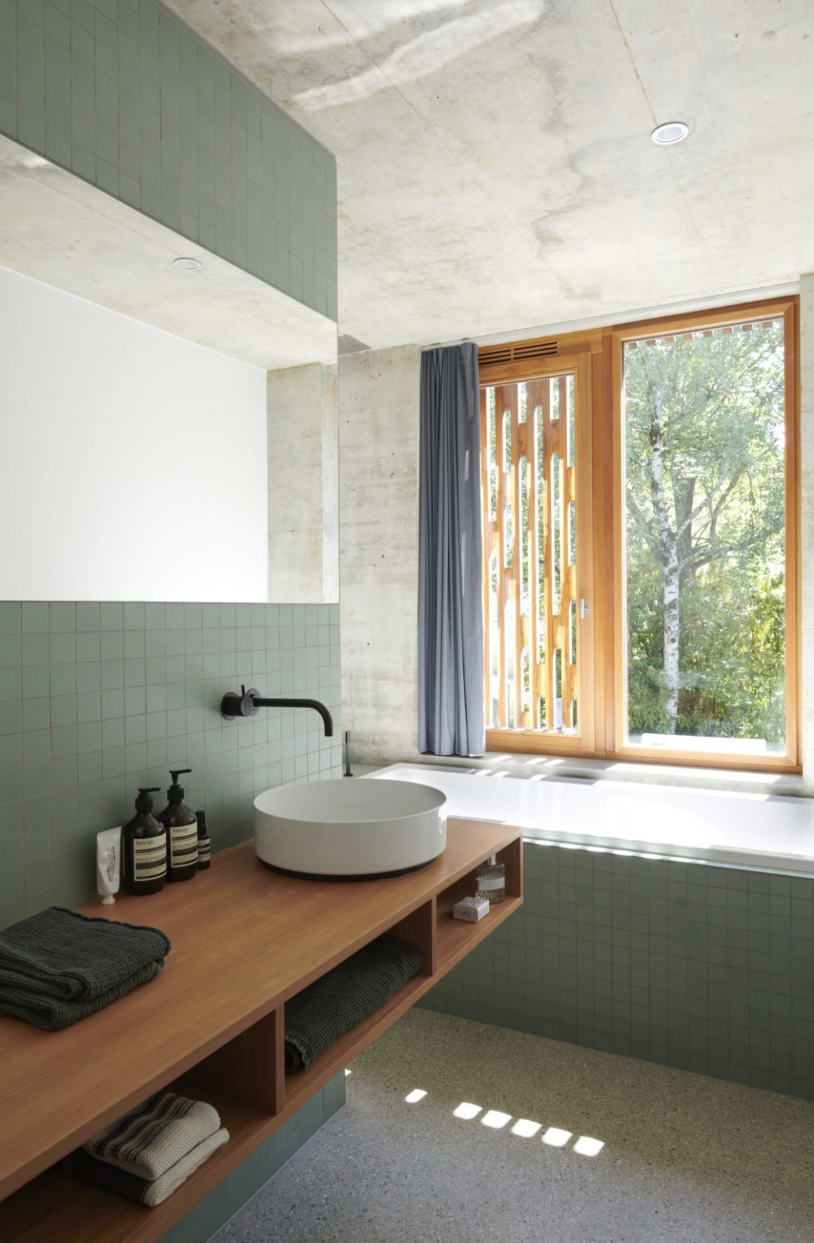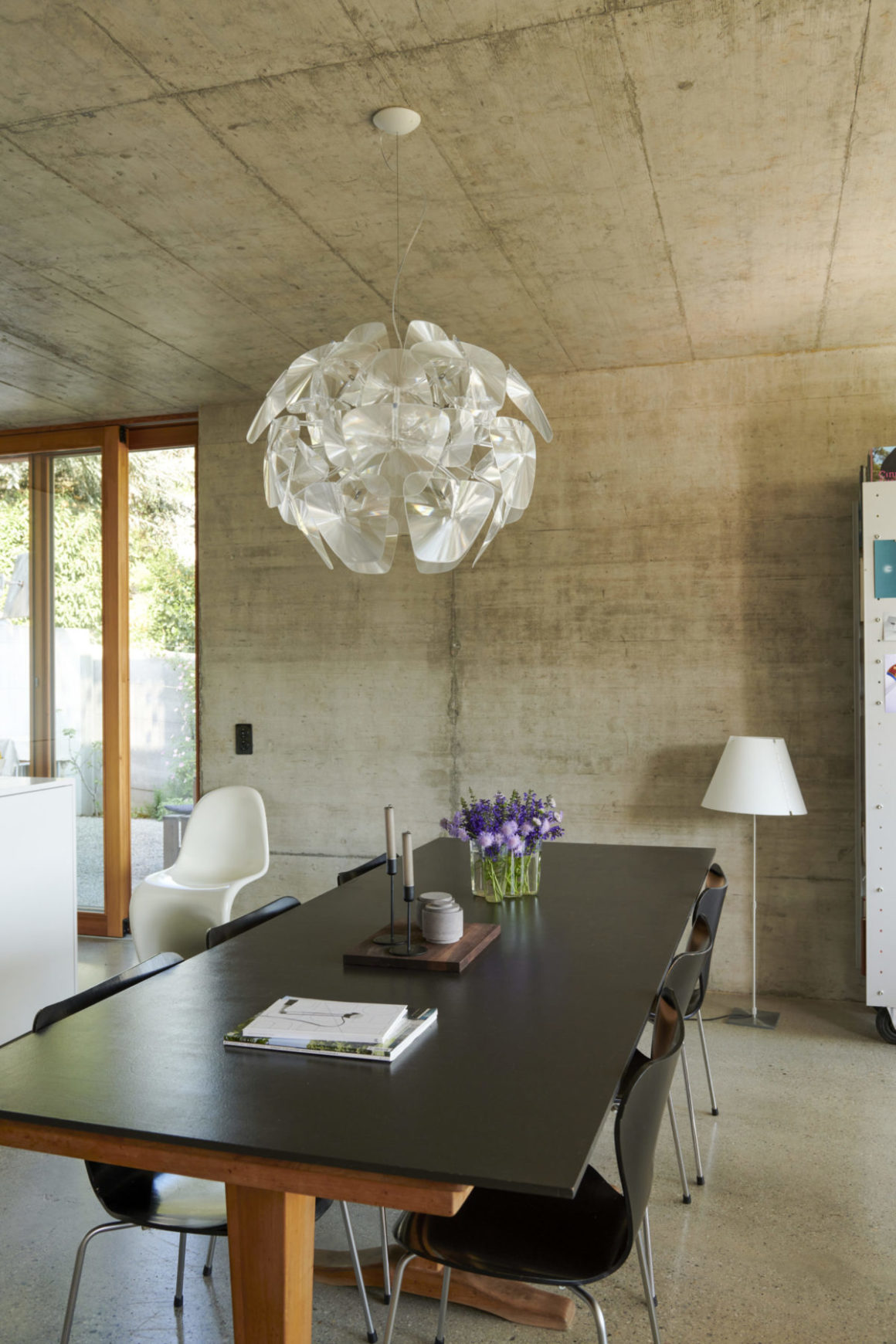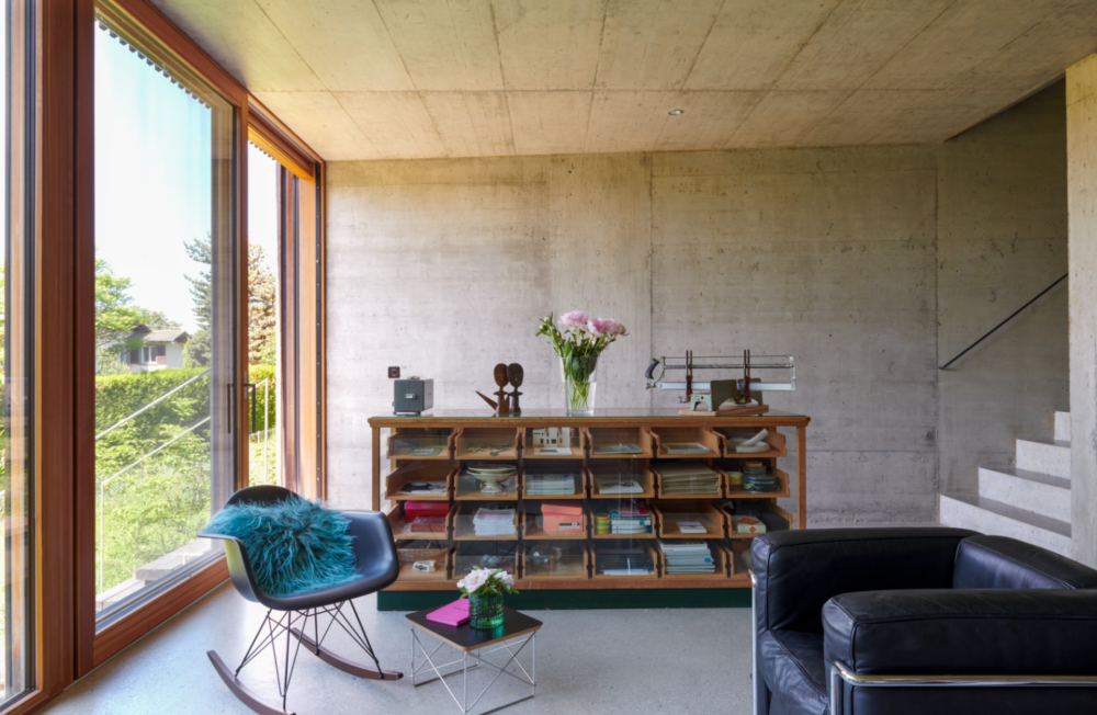 En intérieur, le béton apparent a été utilisé, laissant apparaître la structure des panneaux de coffrage. Les architectes ont choisi un type de béton aussi brut que possible, offrant des traces visibles de fabrication pour contraster avec les meubles et les objets. Par ailleurs, les sols aux dalles poncées révèlent des irrégularités qui créent une texture intéressante.