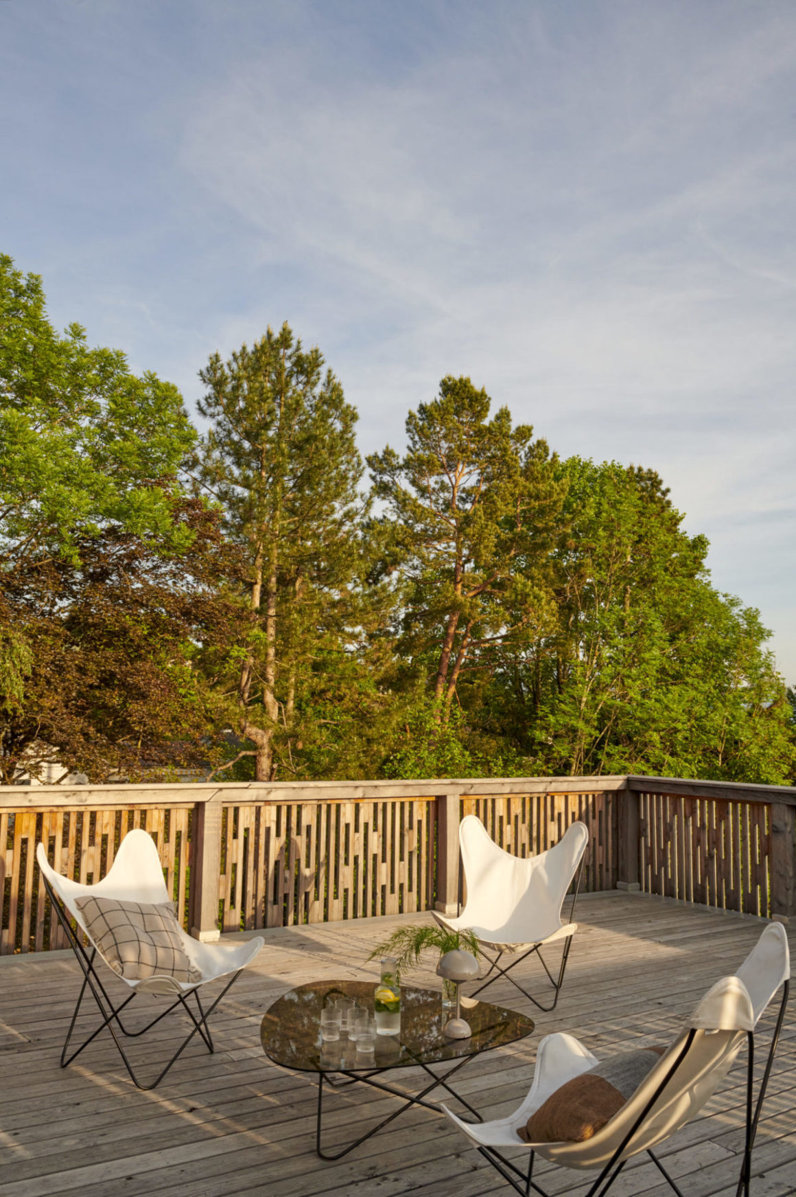 À hauteur de la cime des arbres, la terrasse offre une vue imprenable sur le lac. Fauteuil AA et table AO de Airborne.