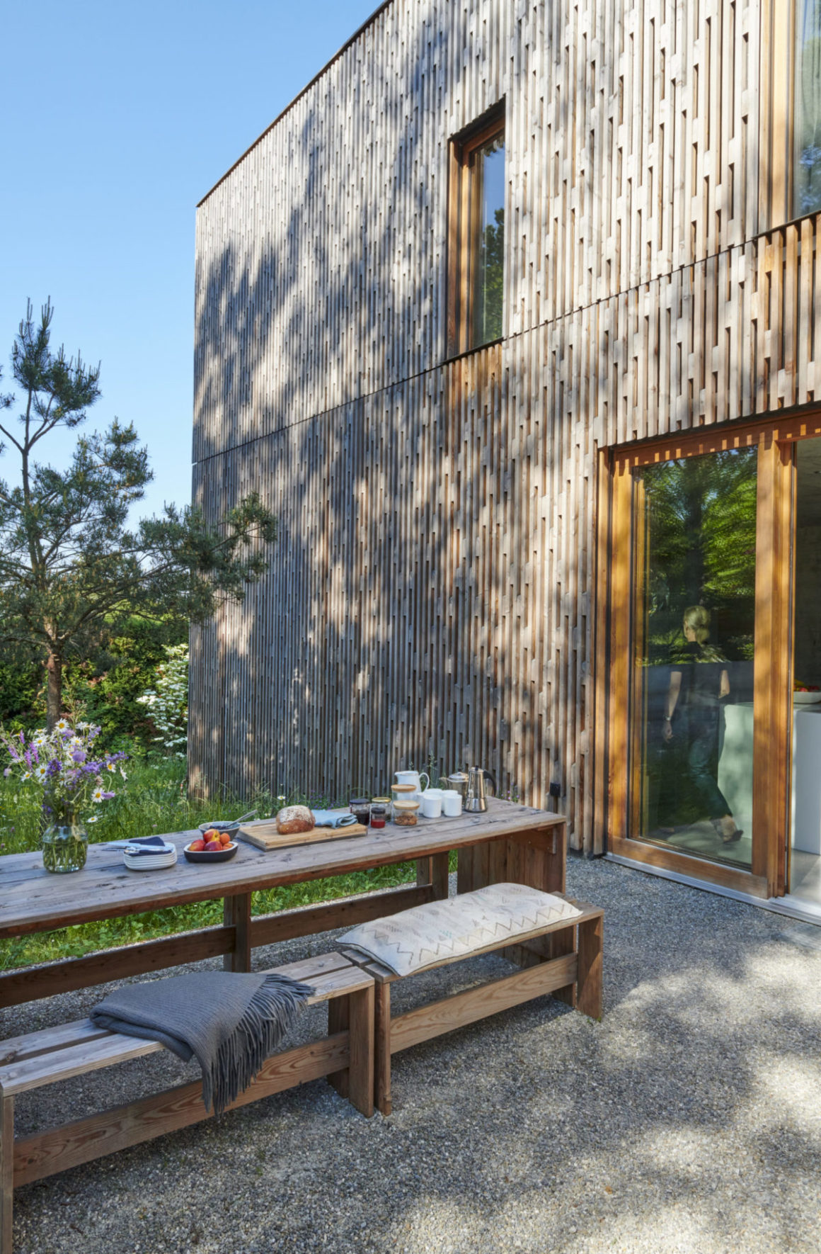Le bardage à claire-voie réinterprète le bardage vertical traditionnel. Table et bancs ont été réalisés avec les chutes de mélèze du toit-terrasse.