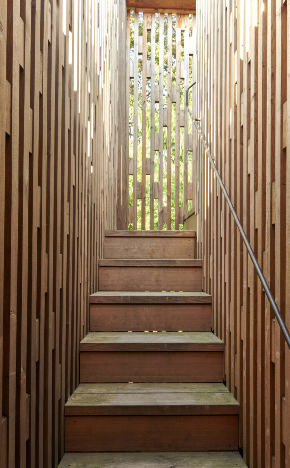 Le choix des matériaux a été réduit à l’essentiel pour créer une esthétique rationnelle et simplifiée. En façade une claire-voie, soigneusement dessinée, revisite le bardage vertical traditionnel. Le bois a été privilégié à l’extérieur pour s’intégrer parfaitement au contexte verdoyant du quartier.