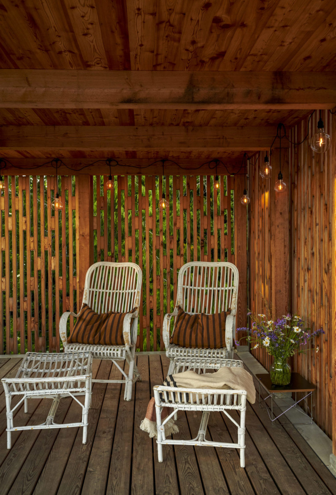 La petite niche offre un abri idéal pour se prélasser dans les fauteuils vintage en rotin.