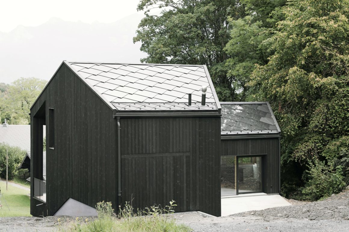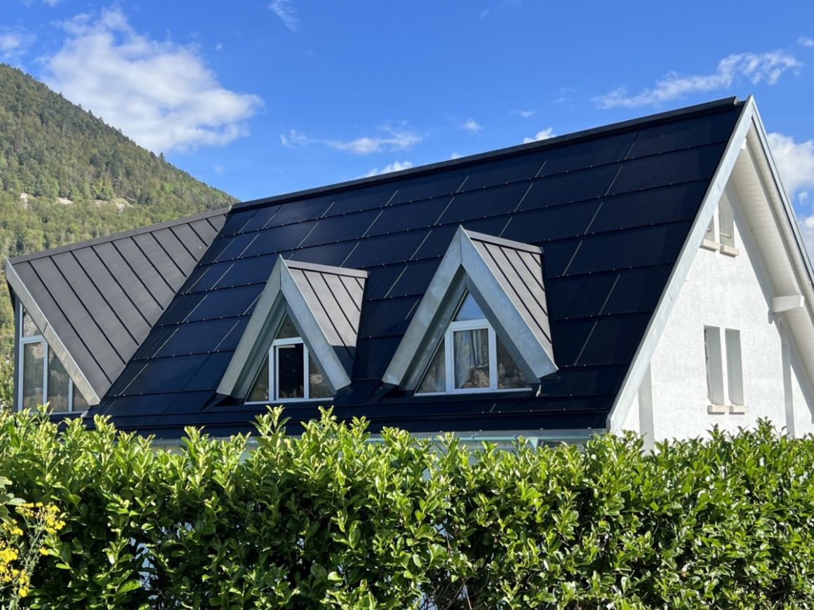 Maison conçue par l’architecte Maria Teresa Federico à Neyres (Suisse). Tuiles solaires: Solaire 1300 Sàrl.
