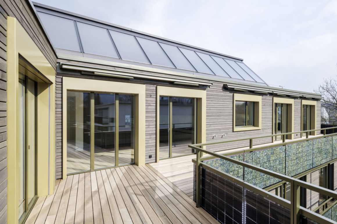 Habiller les balustrades des balcons de panneaux solaires destinés à produire de l’électricité permet notamment de réserver l’usage de la surface du toit pour des panneaux solaires thermiques.