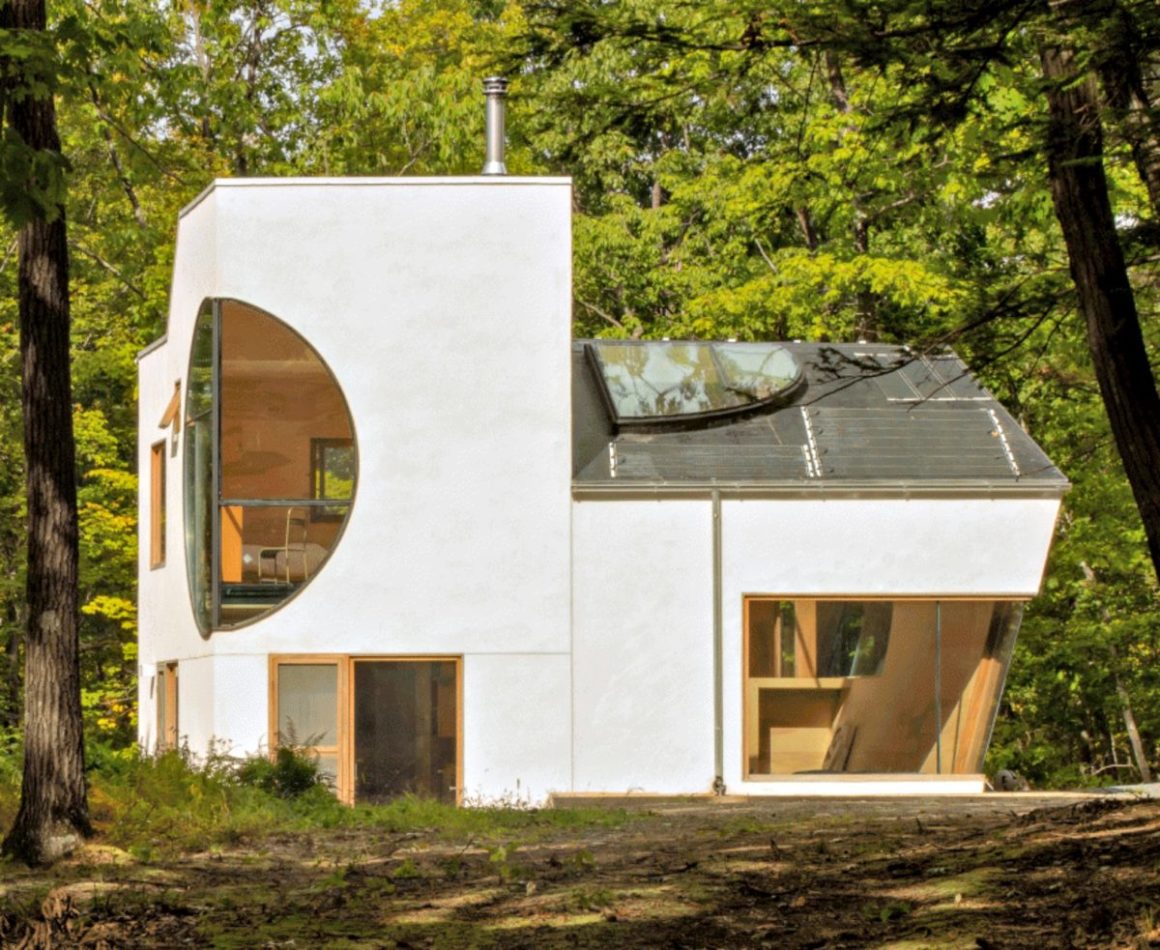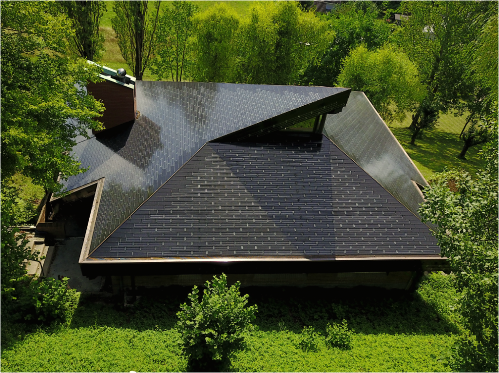 Toiture munie de très minces panneaux photovoltaïques souples et comparables à des bâches SoloPower. Maison à 160 kilomètres au nord de Manhattan. Architecte: Steven Holl.