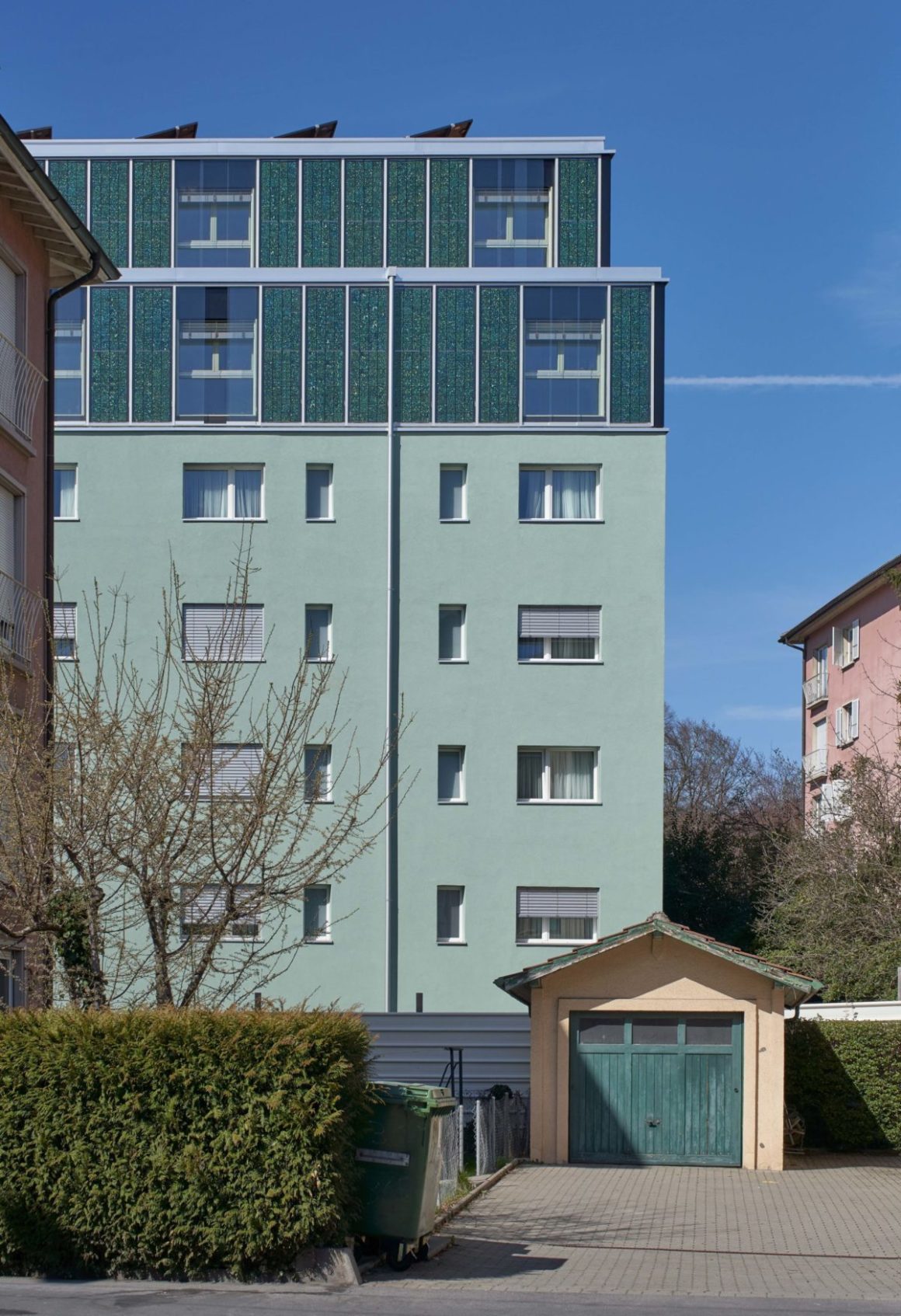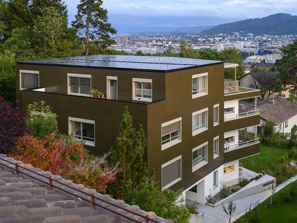 Bâtiment résidentiel dont les façades sont revêtues de modules photovoltaïques imprimés. Résidence à Zurich, dans le quartier de Höngg. Bureau Kämpfen für architektur.