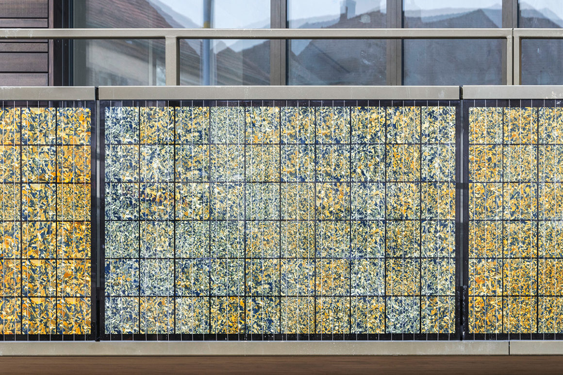 Détail d’un balcon habillé de modules photovoltaïques polycristallins scintillants et dorés, Megasol Energie AG.