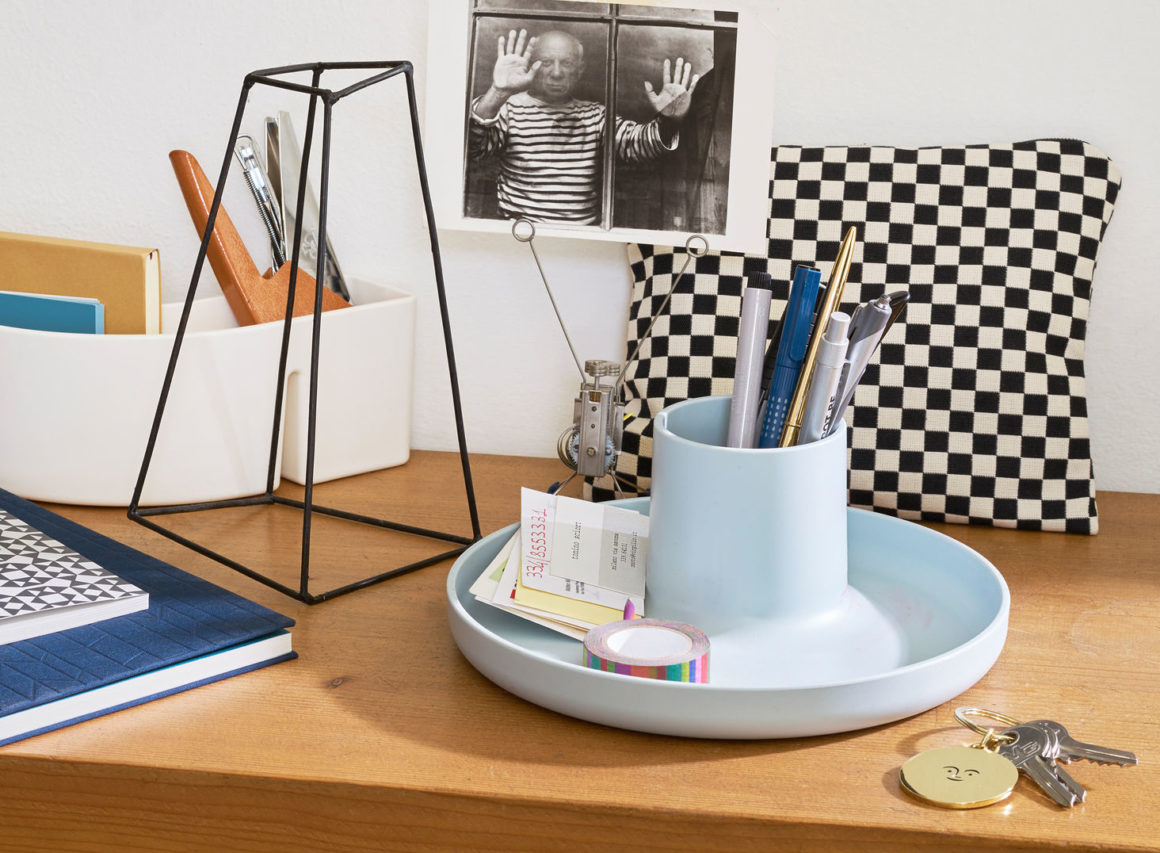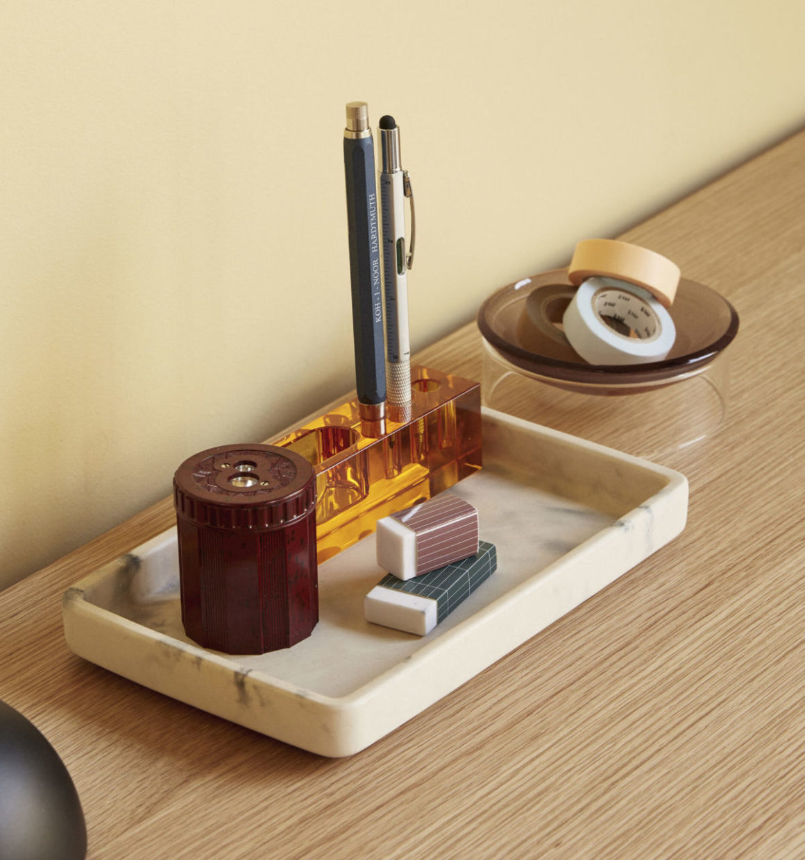 C’est beau et c’est pour mon bureau! Plateaux de rangement élégants, dévidoirs de ruban adhésif sculpturaux, stylos résolument déco, agrafeuses, porte-crayons, presse-papier en forme d’animaux… Pour flatter nos espaces de travail et égayer notre quotidien, rien de tel que les accessoires qui joignent l’utile à l’esthétique. Car un bureau bien rangé, bien organisé et bien décoré permet de garder les idées claires et de rester motivé. Et cela, que l’on soit en home office ou devant le poste de travail d’une entreprise.
