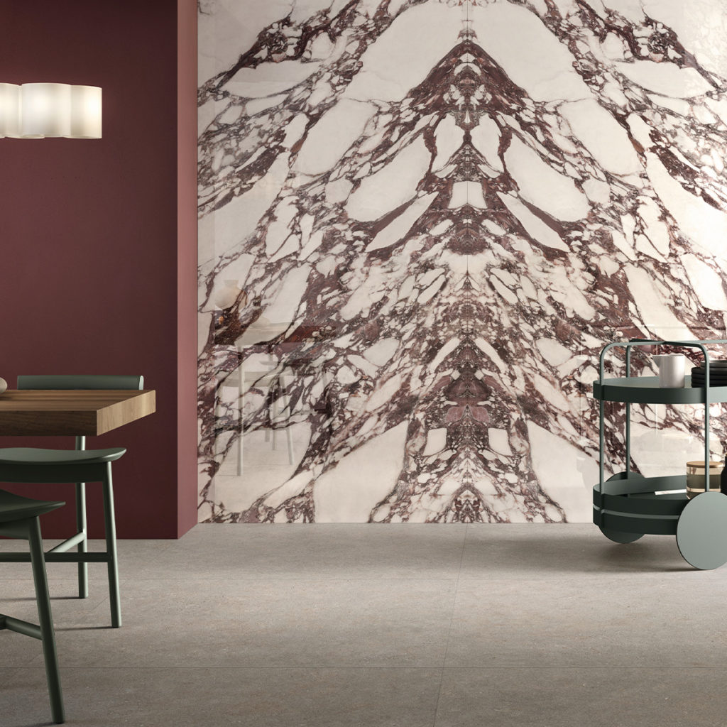 Collection de carrelage Lea Ceramiche en rouge rosé; desserte de couleur vert de gris.