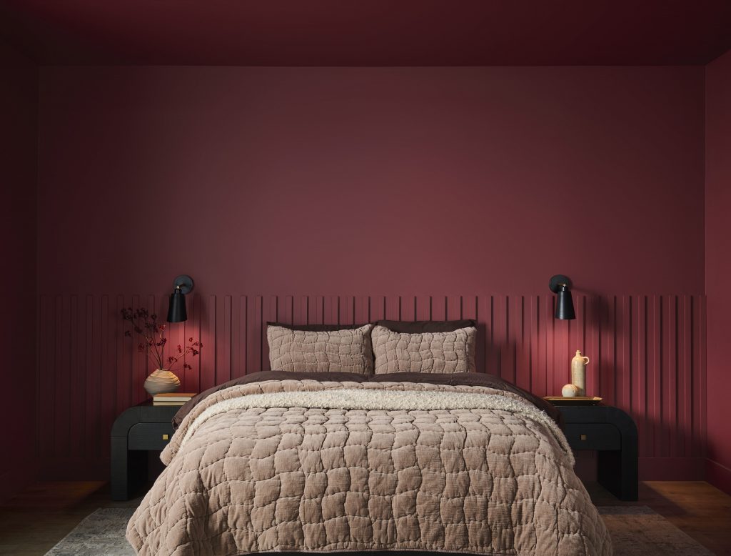 Le fabriquant de peinture Behr Paint met en avant pour 2025 une couleur plutôt rare dans nos intérieurs: le rouge, qu’il adoucit et rend profond avec une pointe de rose. La nuance se nomme Rumors MQ1-15.