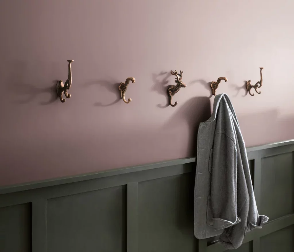 Benjamin Moore propose d’associer le violet bruni au bleu ardoise ou au vert de gris (vert et rose sont des couleurs complémentaires).