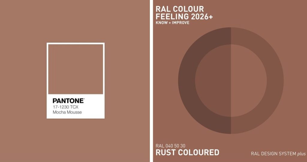 De gauche à droite: Mocha mousse (17-1230) élu couleur de l’année par Pantone; RAL Rust coloured (040 50 30).