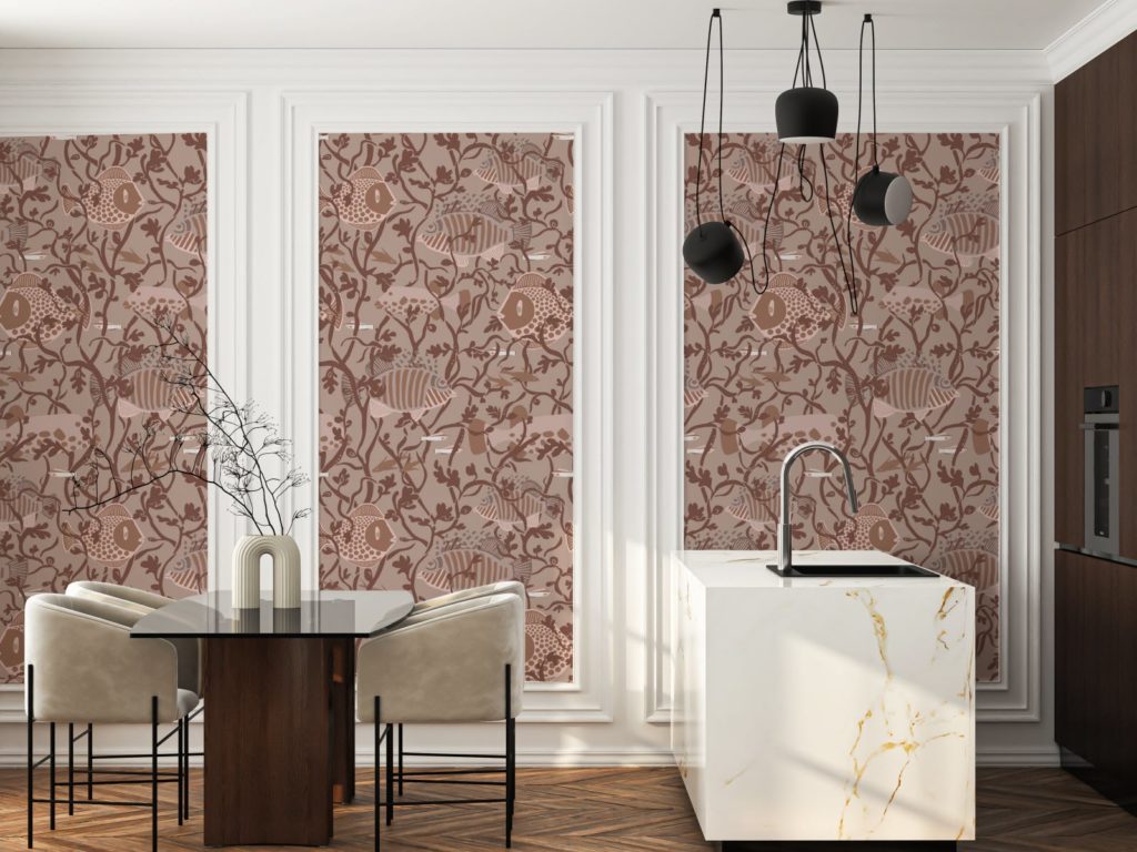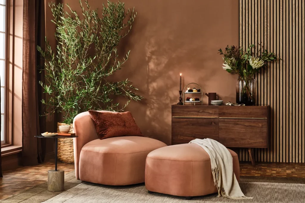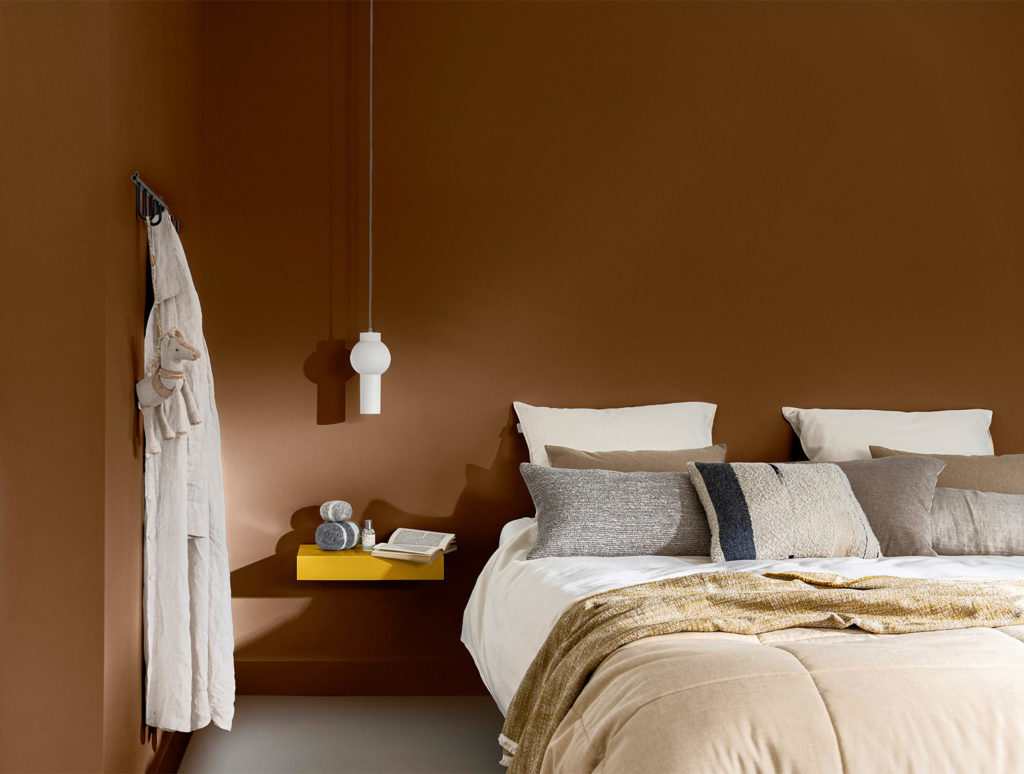 Pour une ambiance régénérante, qui reflète notre envie de nature, on associe cette couleur aux beiges et aux bruns plus foncés dans un camaïeu de tons apaisants.  Le marron gourmand tire vers la couleur pêche, ce qui permet d’amener la palette du décor vers des nuances chaudes et gourmandes comme l’orange