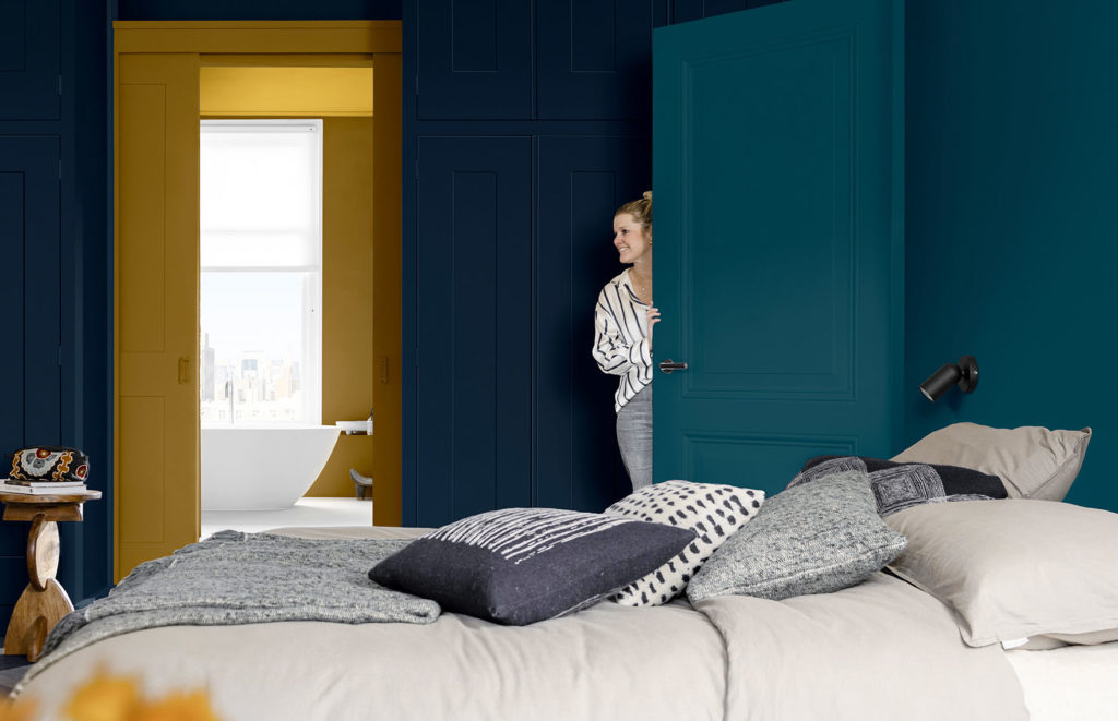 Ambiance créée par le fabriquant Behr Paint autour de la couleur Rumors. Une couverture de couleur taupe vient adoucir l’ambiance.