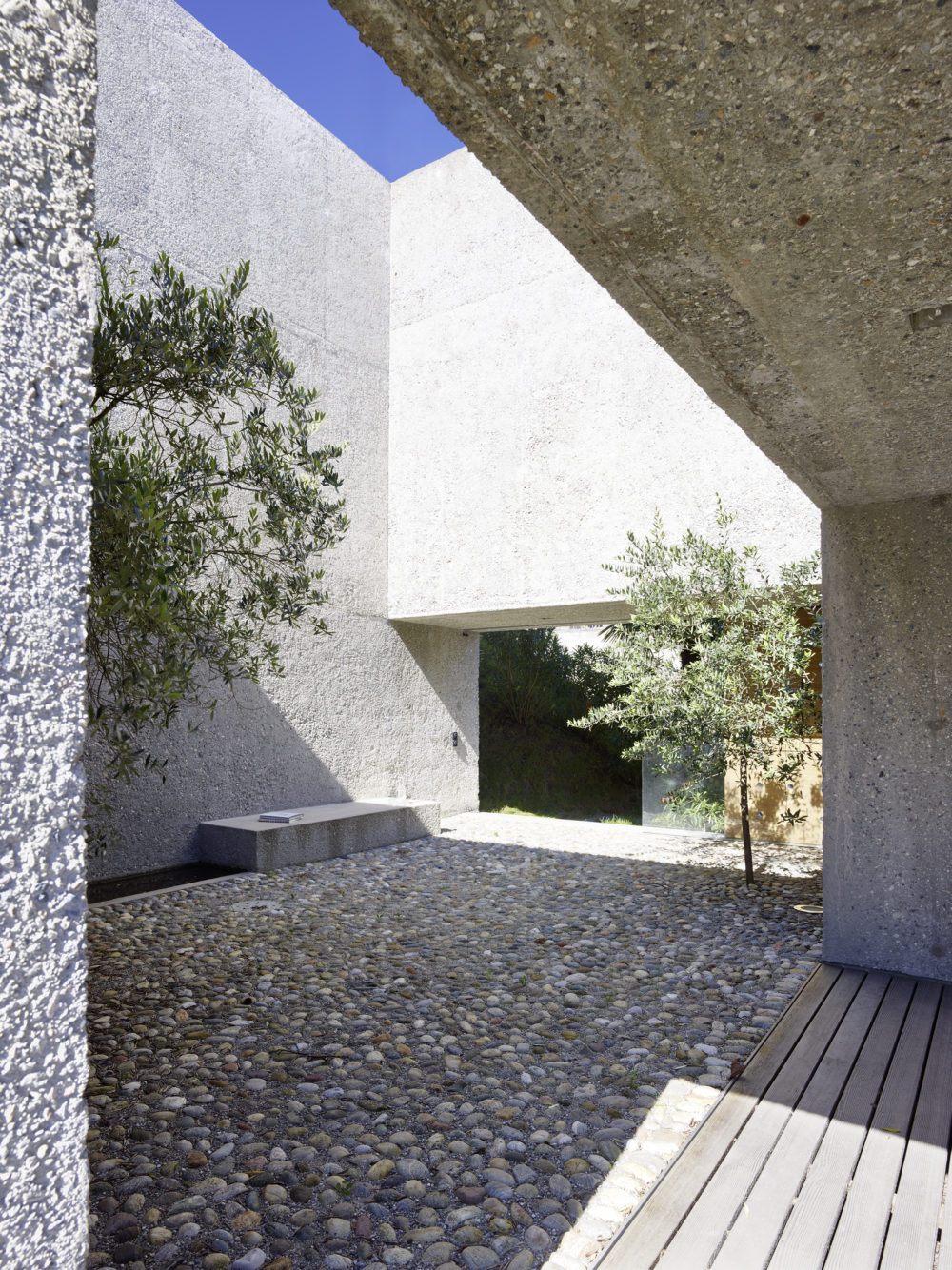 Monolithe massif implanté sur une pente douce, dont le parement est du béton désactivé. La rampe aménagée au sud-est donne accès aux pièces à vivre.