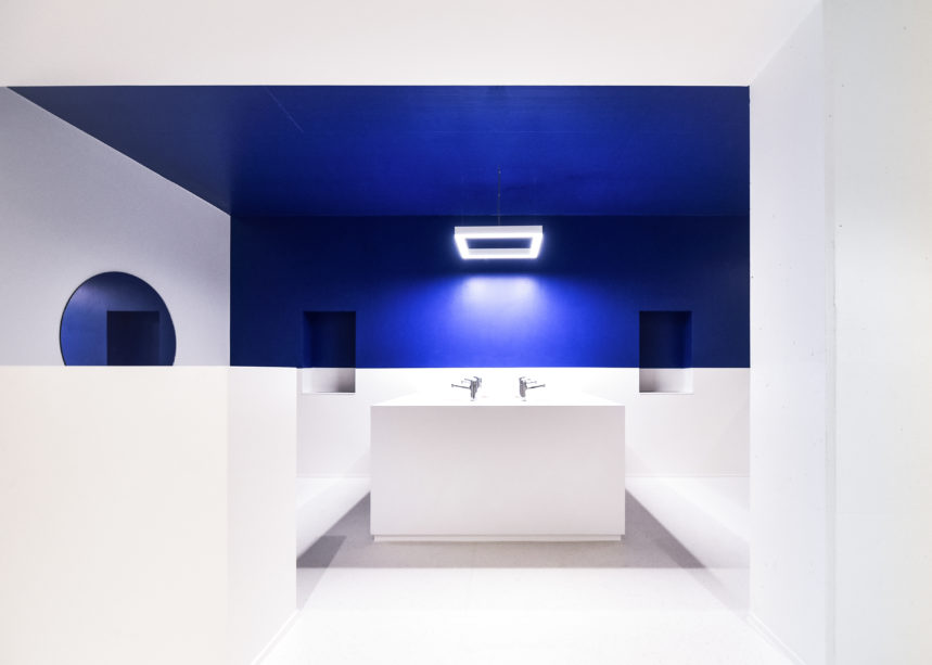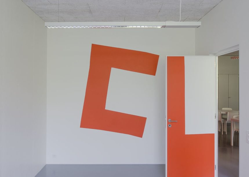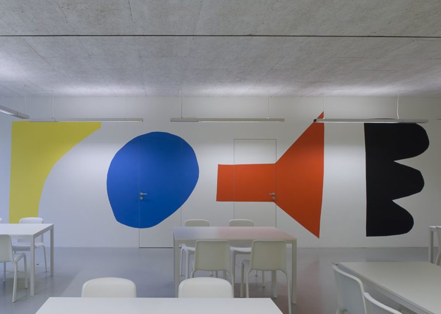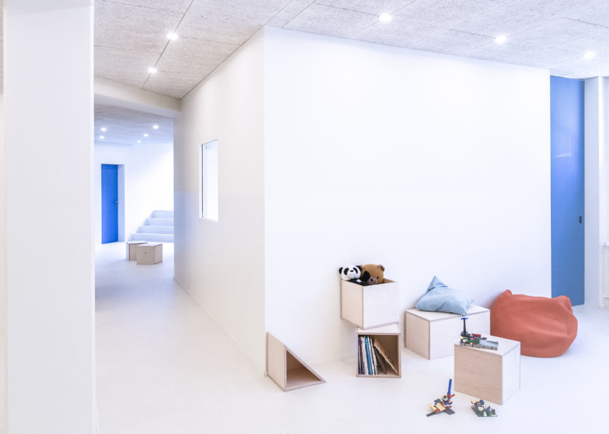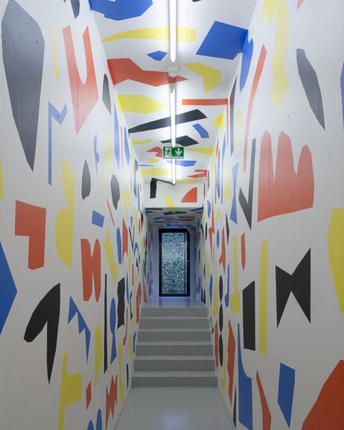 Les fresques murales de formes libres, colorées et sans figuralisme, réalisées par l’atelier Bingo fait justement partie des éléments remarquables de l’accueil de jour.Les deux artistes français travaillent la couleur sous forme d’aplats dans l’espace architectural laissé volontairement brut, d’un blanc immaculé, comme toile de fond.