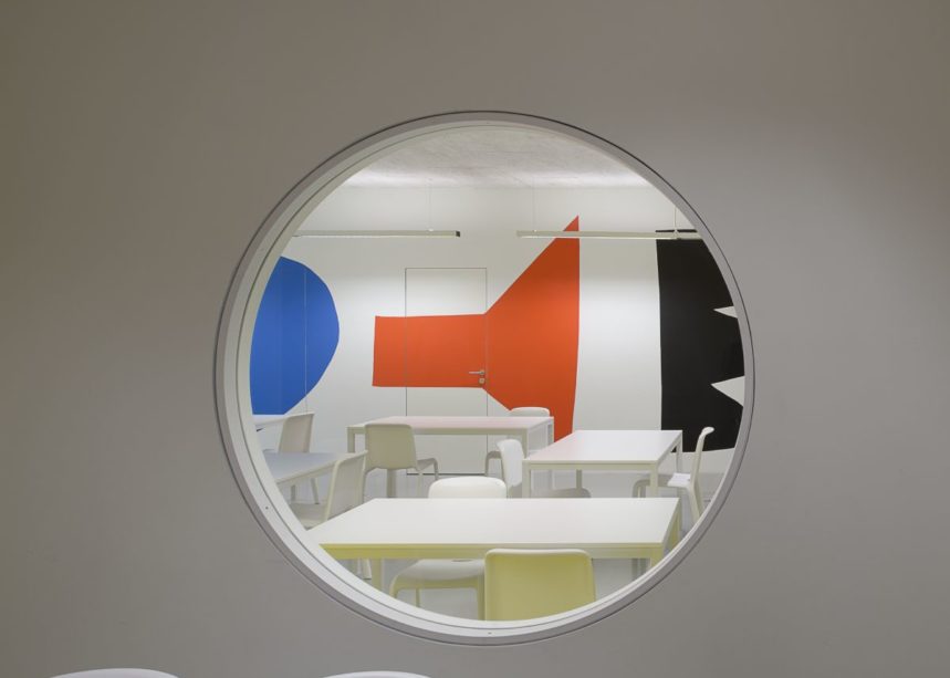 L’organisation spatiale est simple et efficace: le grand cou loir et les services forment l’épine dorsale avec, de part et d’autre, de généreuses salles de vie auxquelles sont adossées de plus petites salles de travail. Les salles de vie, baignées de lumière na turelle par des grandes baies vitrées, permettent un second jour dans les salles annexes grâce à des fenêtres intérieures intégrées dans des fresques colorées qui animent les parois lisses.