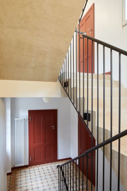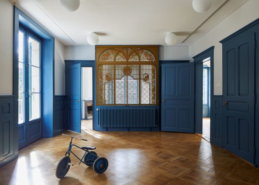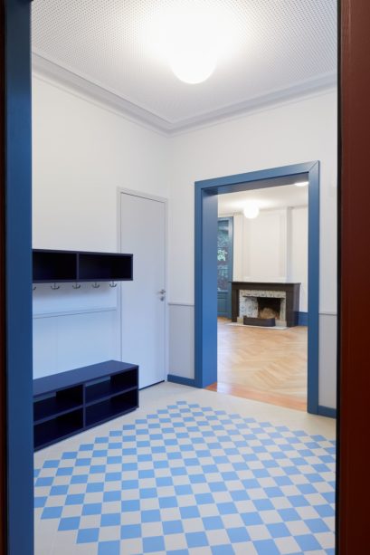 Le rouge et le bleu colorent les menuiseries existantes et rappellent les teintes anciennes de la riche décoration intérieure de la maison familiale. Les carreaux en ciment, caractéristiques de la fin du 19e siècle, ont été récupérés et installés de manière à simuler des tapis sur les sols des étages, dans le respect du code couleur.