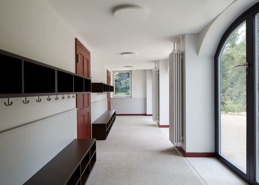 Les architectes souhaitaient perpétuer l’unité et la cohérence du lieu par le maintien d’éléments constructifs et architecturaux existants dévoilés et remis en état. La suppression de l’extension attenante à la façade Ouest a dévoilé trois arcades existantes en pierre au rez inférieur en lien direct avec le parc, reconverties en entrée principale. Au sein du bâtiment, les espaces de vie se situent côté jardin et forêt. Les services ont été rassemblés dans un noyau central, légèrement décalé, permettant une circulation périphérique.
