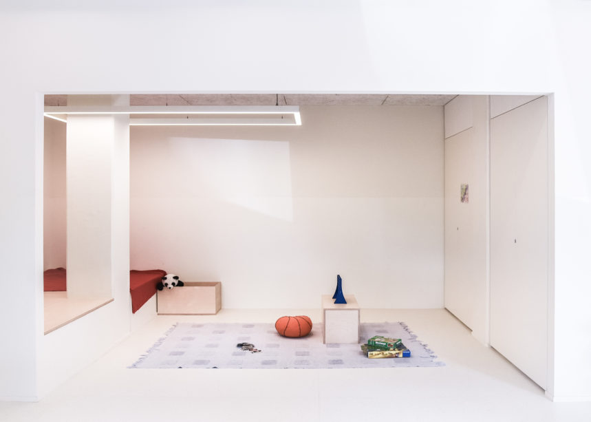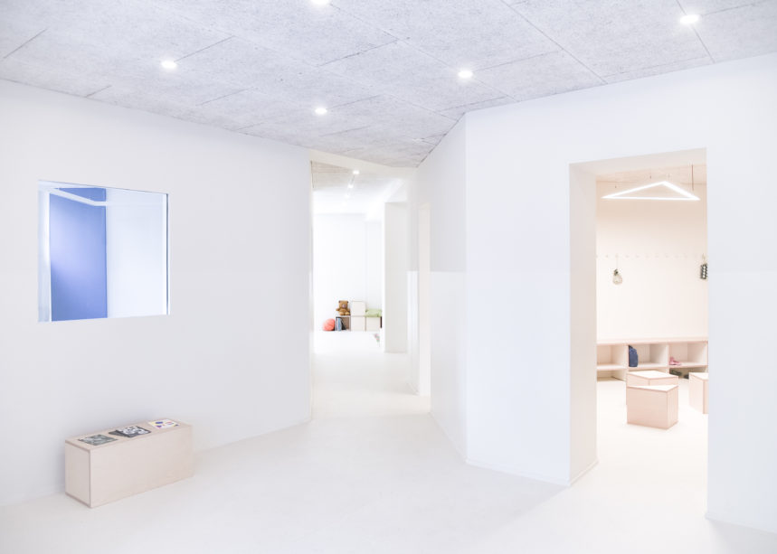 C’est au rez inférieur de l’école, sur le site du collège des Alpes à Pully, que l’accueil de jour « Le Cube » s’est installé. Le bâtiment originel conçu par Frundgallina Architectes, typique des années 2000 par sa typologie « swiss box » en béton est implanté dans la pente, avec un hall de distribution généreux et de larges ouvertures en façade.