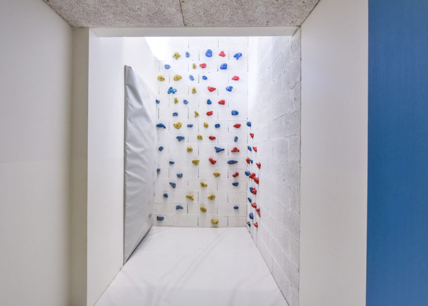 Un des enjeux du projet est le peu d’apport de lumière naturelle. Les espaces communicants, de même que les ouvertures dans les parois intérieures, permettent à la fois un lien visuel et apportent de la lumière en second jour jusque dans la profondeur du bâtiment. À l’arrière, on trouve naturellement les salles d’eau. On entend d’ailleurs ruisseler les conduites existantes volontairement laissées apparentes et non isolées, comme au fond d’une grotte. Un petit amphithéâtre dans la partie sombre et une mini paroi d’escalade qui profite de la trémie de l’escalier enrichissent la pédagogie du lieu.